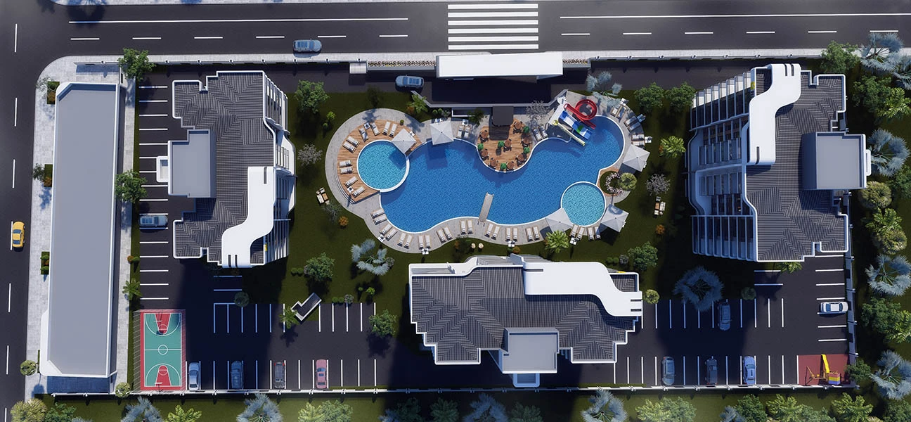 The project is located in the center of the district's life: the proximity of the largest shopping malls, airport hotels, restaurants and cafes, and other social facilities. The project is being built on Road 40, the largest artery of the district, which additionally guarantees stability and demand for rental of commercial premises.