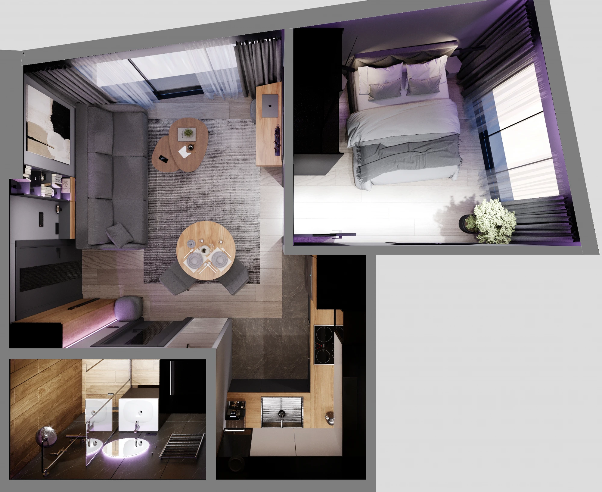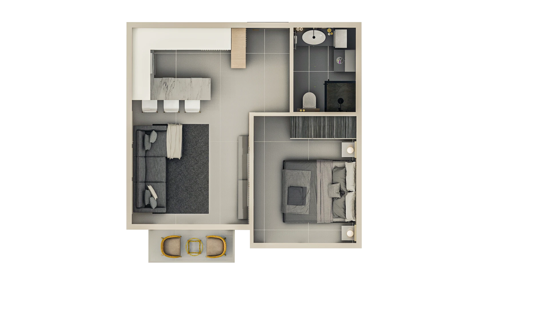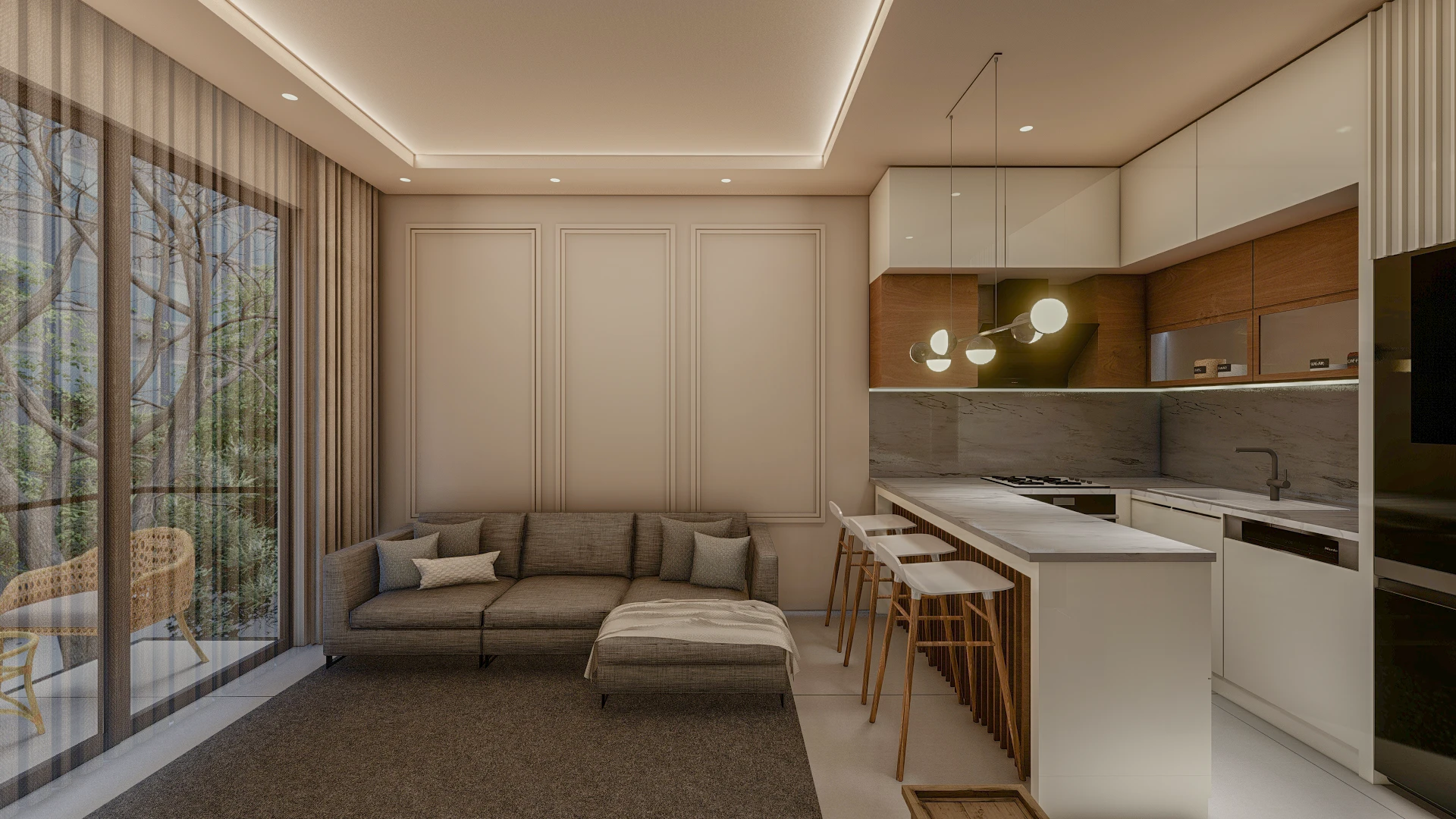 In the project, the price already includes air conditioners in all rooms, electric shutters, a turnkey bathroom, a built-in kitchen and a set of household appliances from 3 units (induction panel, extractor hood and oven), underfloor heating.
