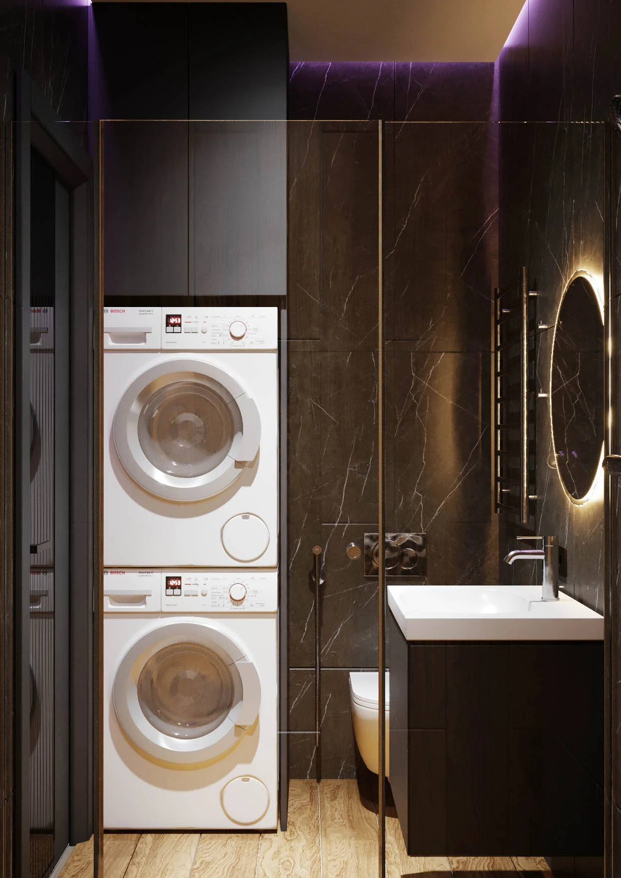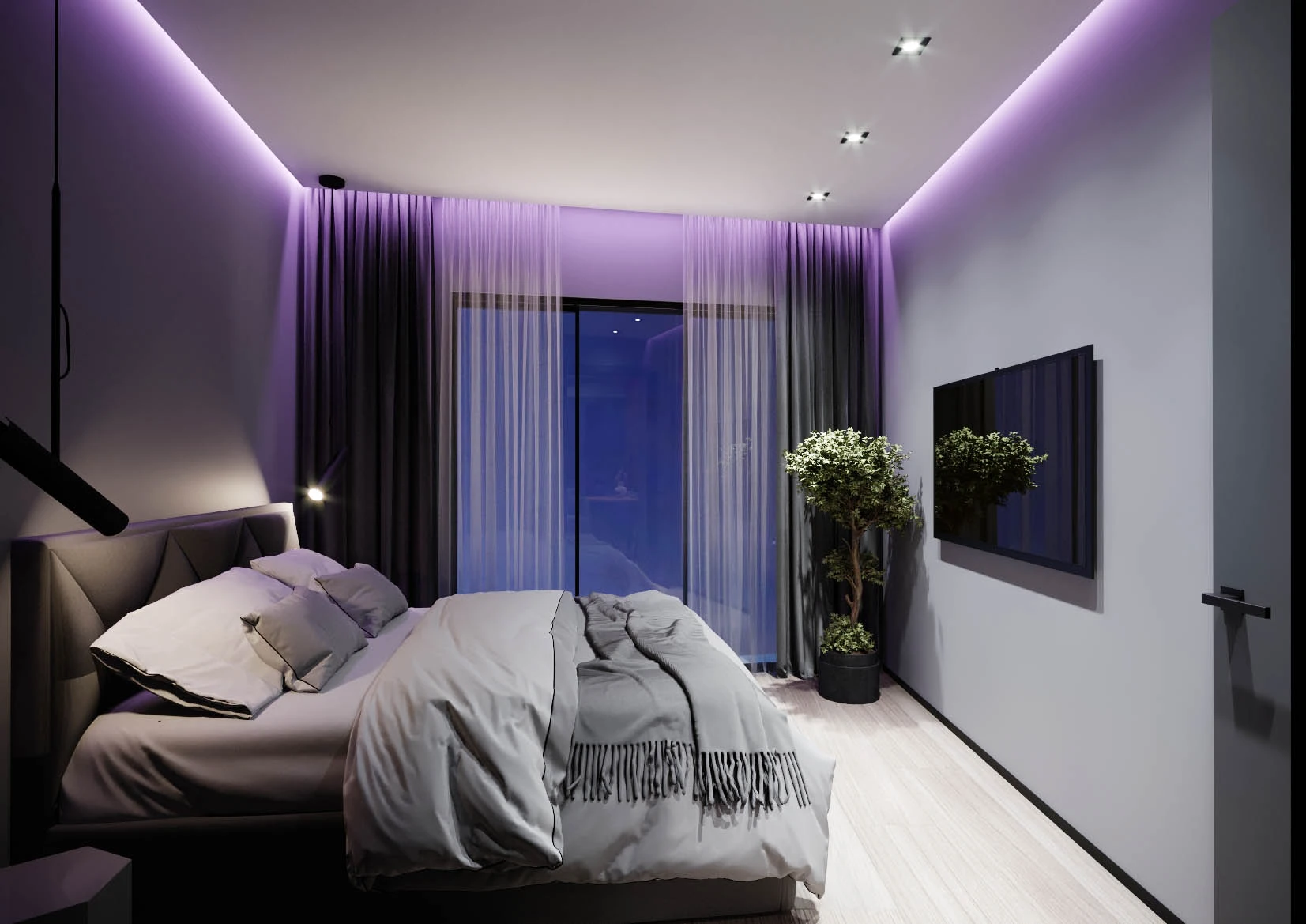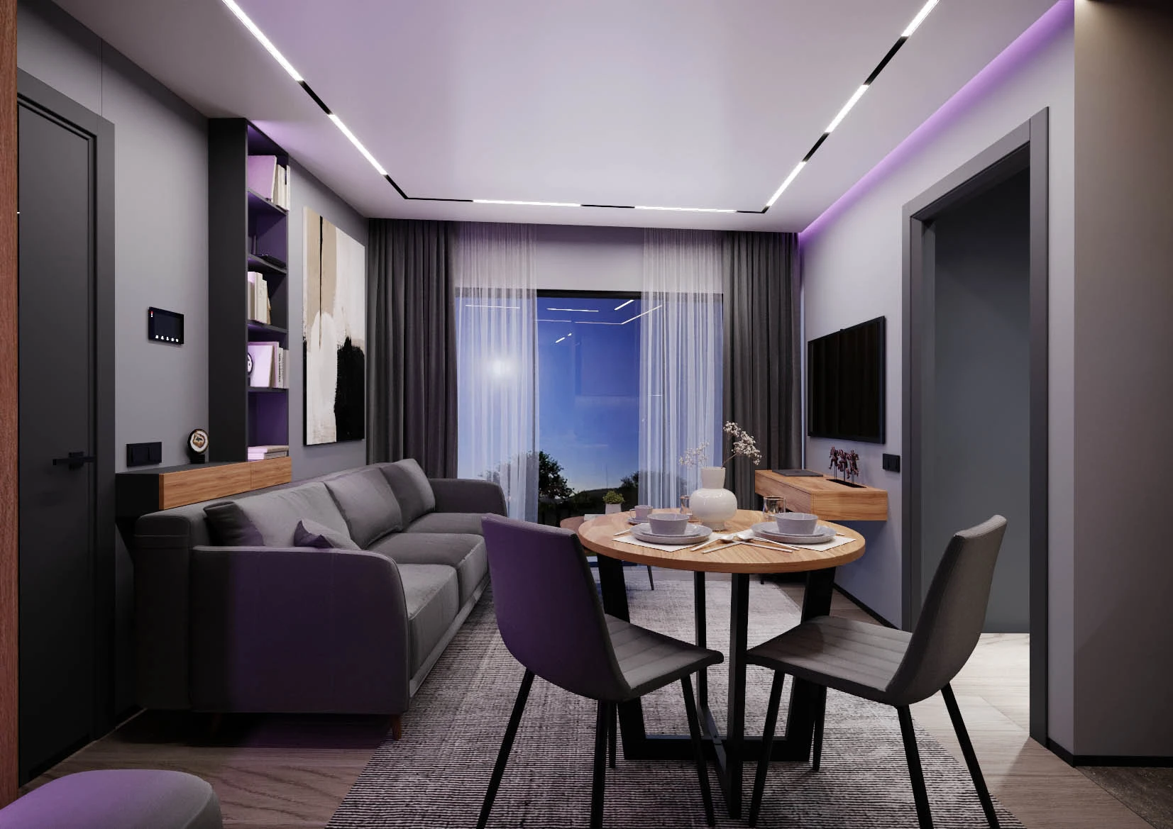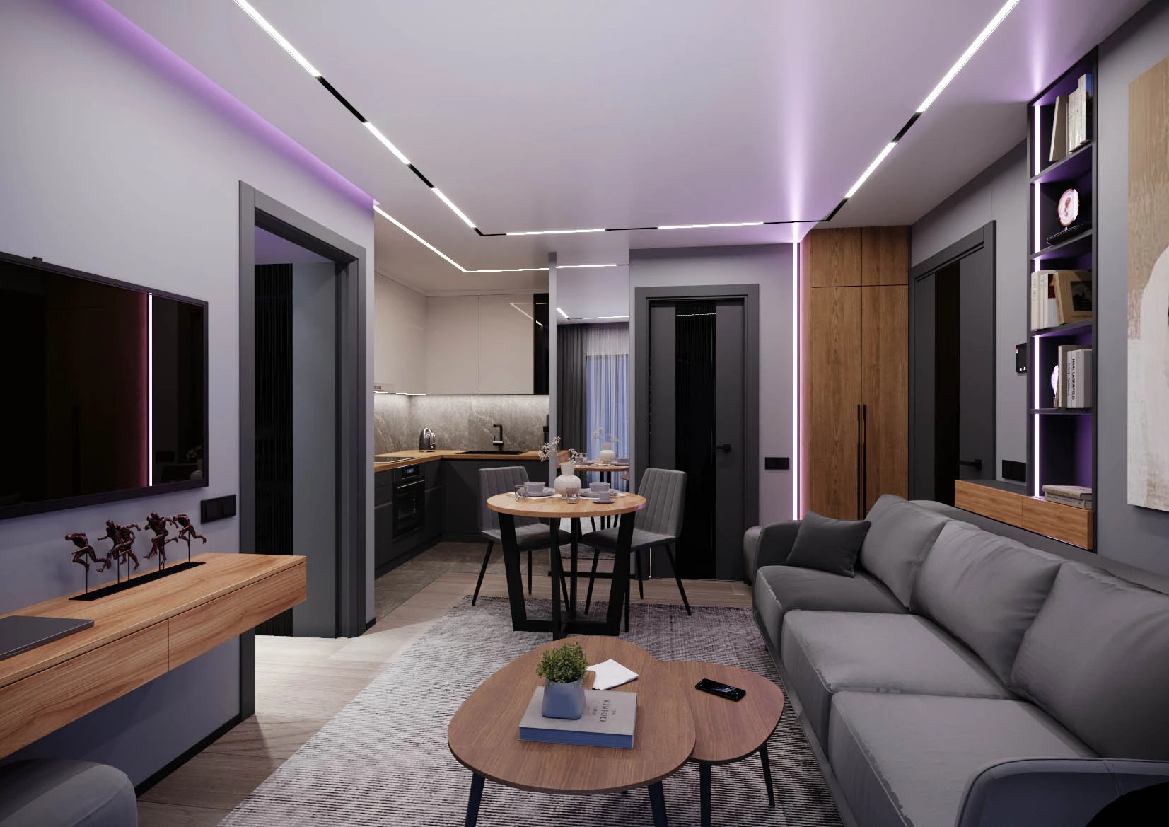 In the project, the price already includes air conditioners in all rooms, electric shutters, a turnkey bathroom, a built-in kitchen and a set of household appliances from 3 units (induction panel, extractor hood and oven), underfloor heating.