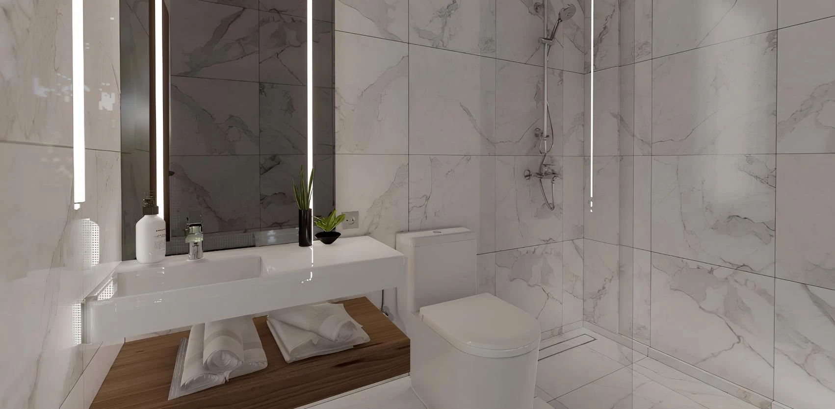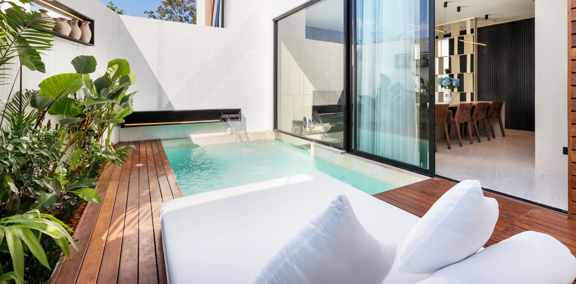 The townhouses range from 75 to 108 square meters. With a fully fitted look (furniture, fitted kitchen, appliances, sanitary ware, decor and landscaping, smart home system). On the territory of the terrace with swimming pool and sun loungers.