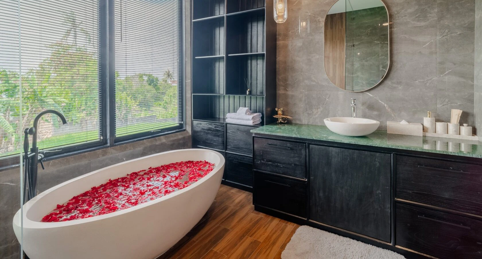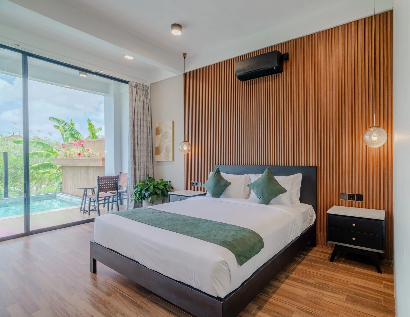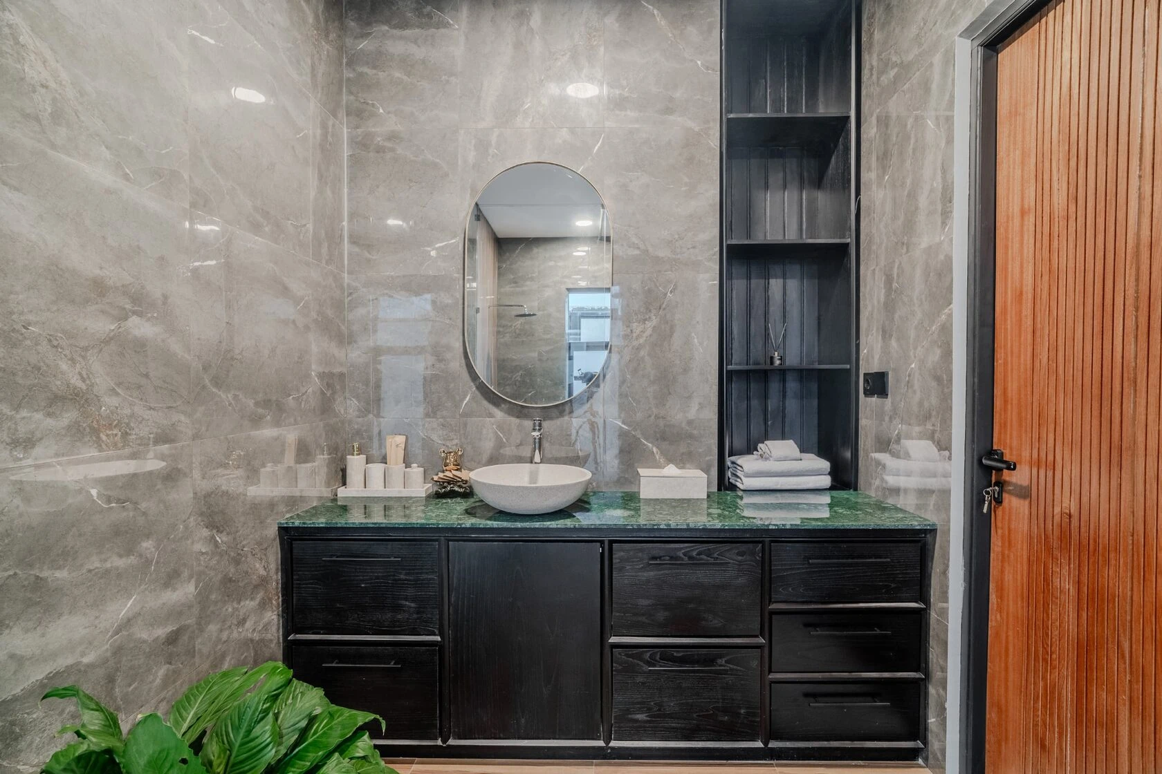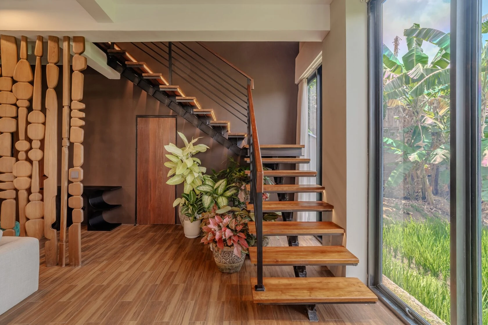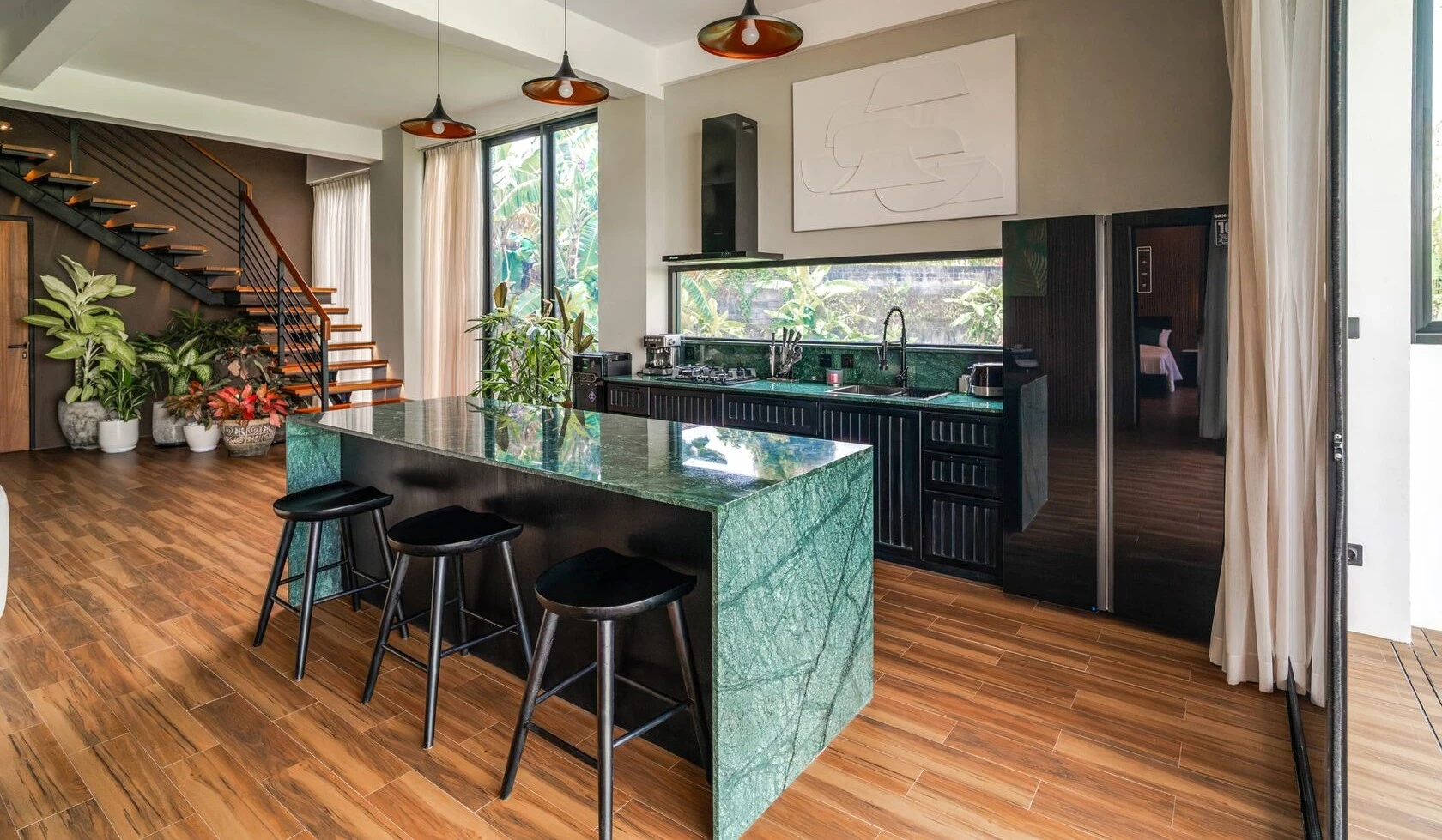 The villa is designed in a modern Balinese style: spacious rooms, panoramic windows, and an open-plan living area. Interiors are finished in light tones with natural materials such as wood and stone, creating harmony with Bali’s tropical surroundings.