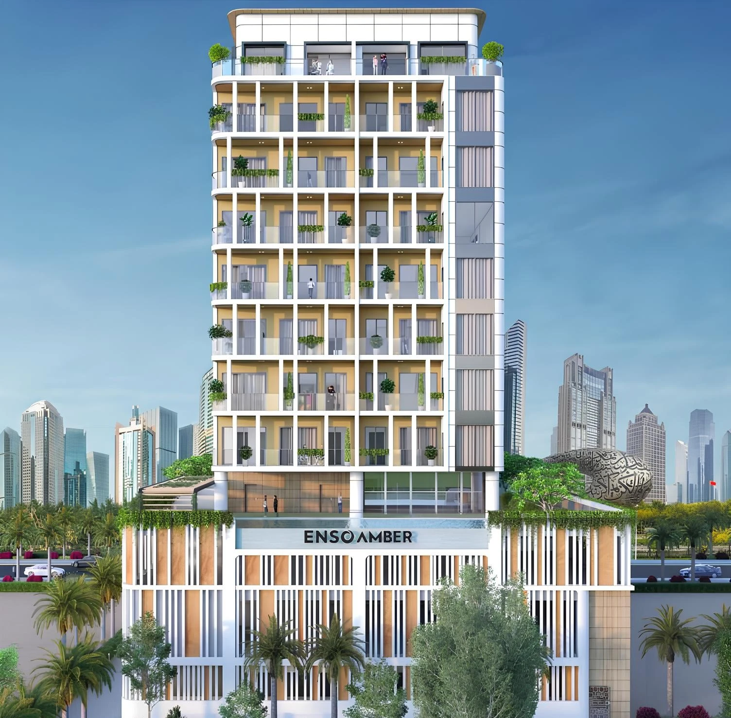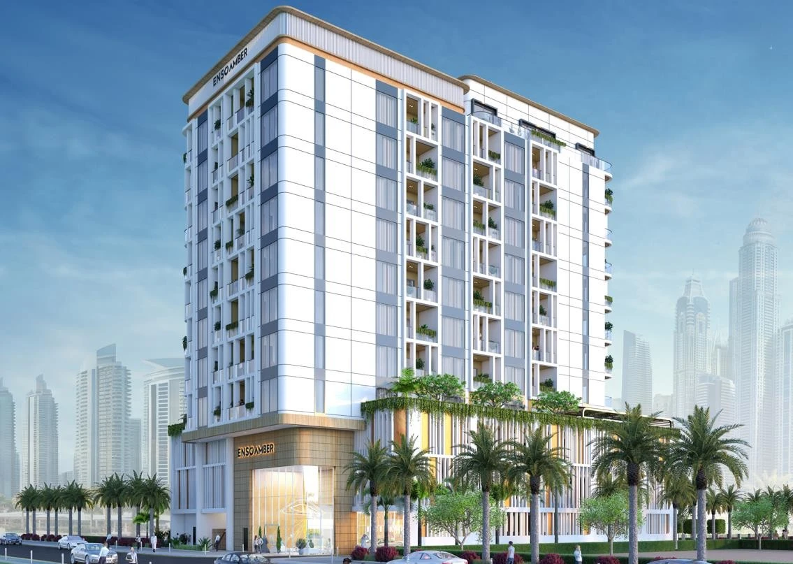 Amber by Enso is a modern development by ENSO Development, located in the prestigious Jumeirah Garden City. The project combines refined architecture, smart layouts, and a central location. The building configuration includes a ground floor, two podium levels, eight residential floors, and a rooftop with leisure facilities.