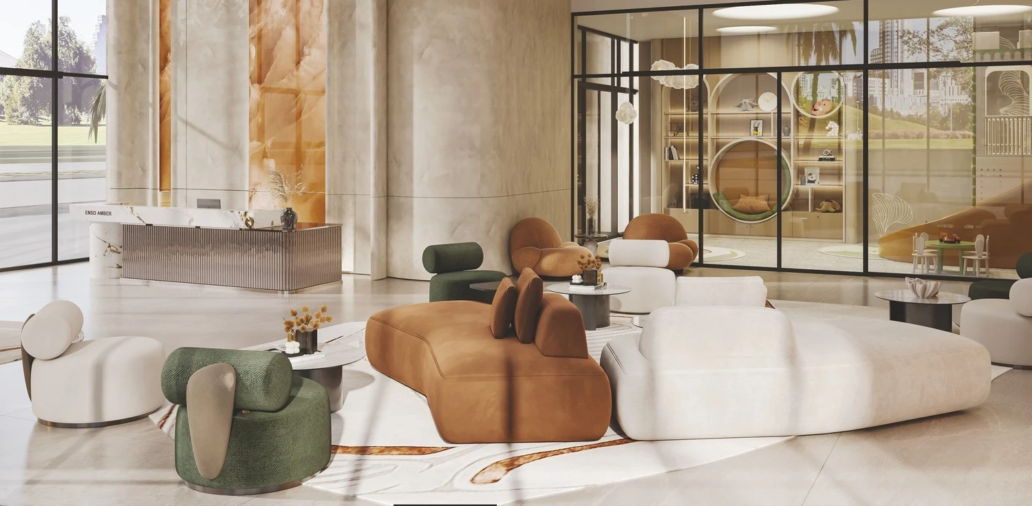 Amber by Enso stands out with its sophisticated facade, floor-to-ceiling windows, and clean lines, creating a sense of lightness and space. The layouts are designed for maximum comfort, while the rooftop offers panoramic views of Dubai.