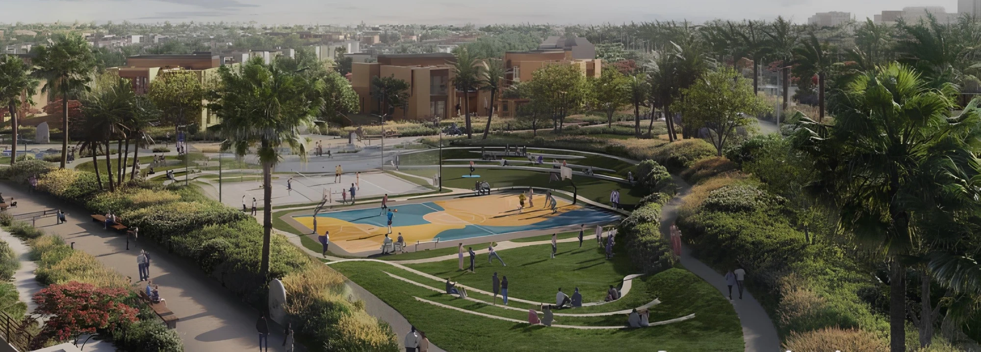 — Sports courts, jogging tracks, and picnic areas;