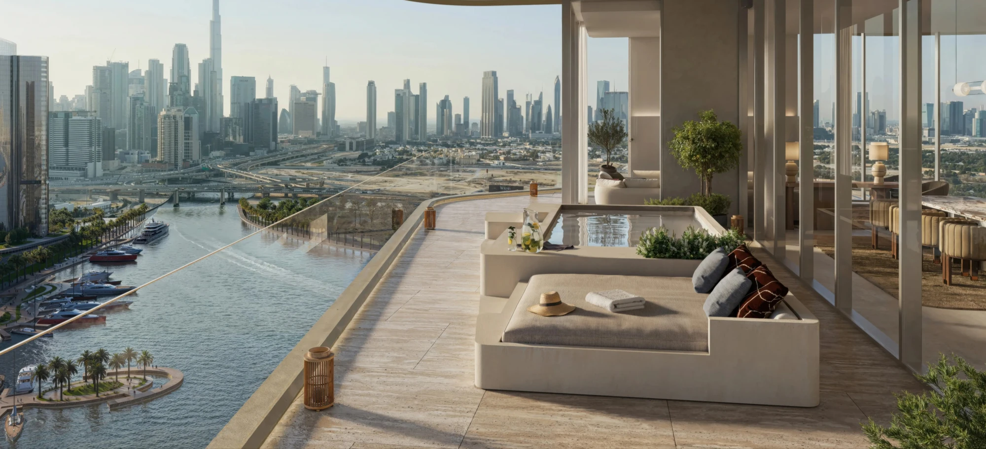 The tower features a striking architectural identity defined by purposeful lines and refined geometry. The building consists of a ground floor, 34 residential levels, an amenities floor on level 21, and a rooftop. Residences include 1, 2, and 3-bedroom apartments, as well as duplex 4-bedroom penthouses with private rooftop pools. All units are delivered semi-furnished and include fully equipped kitchens with built-in appliances.