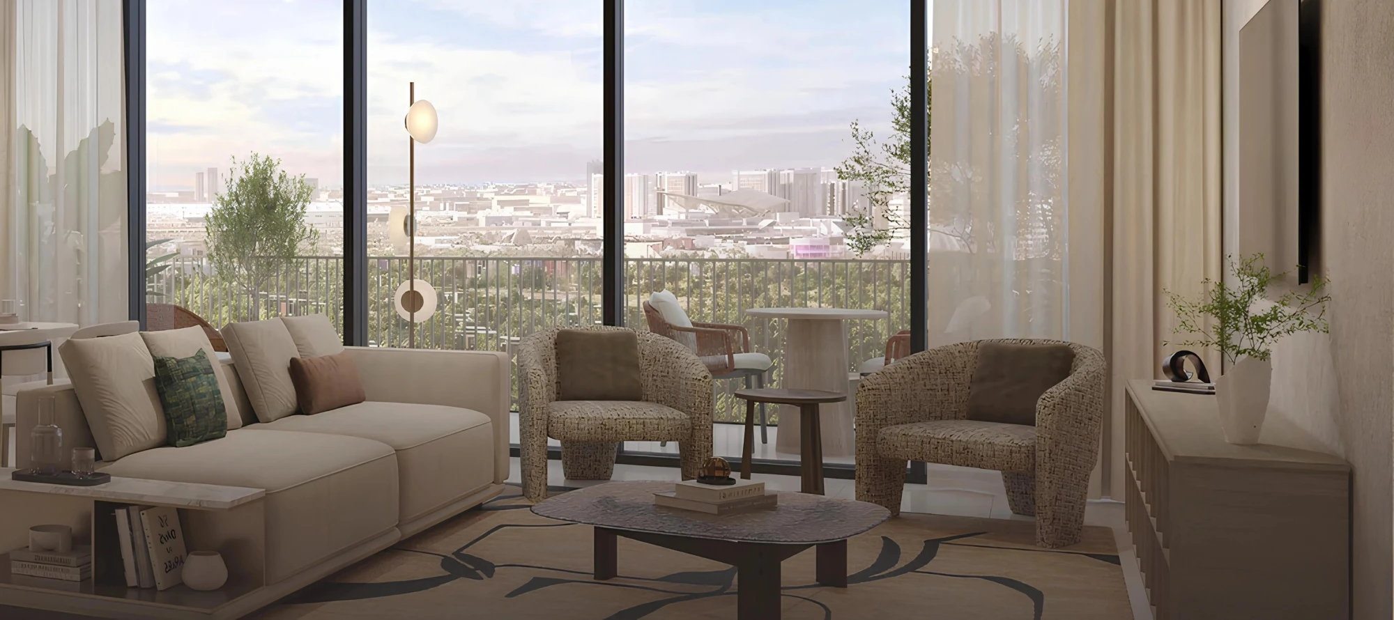 The development offers a selection of 1-, 2-, and 3-bedroom apartments. Each apartment features well-planned layouts, spacious interiors, and floor-to-ceiling panoramic windows that flood the living spaces with natural light. Premium finishes add elegance and comfort, supporting a high-quality residential experience. Apartments are delivered partially furnished, with fitted kitchen appliances included.