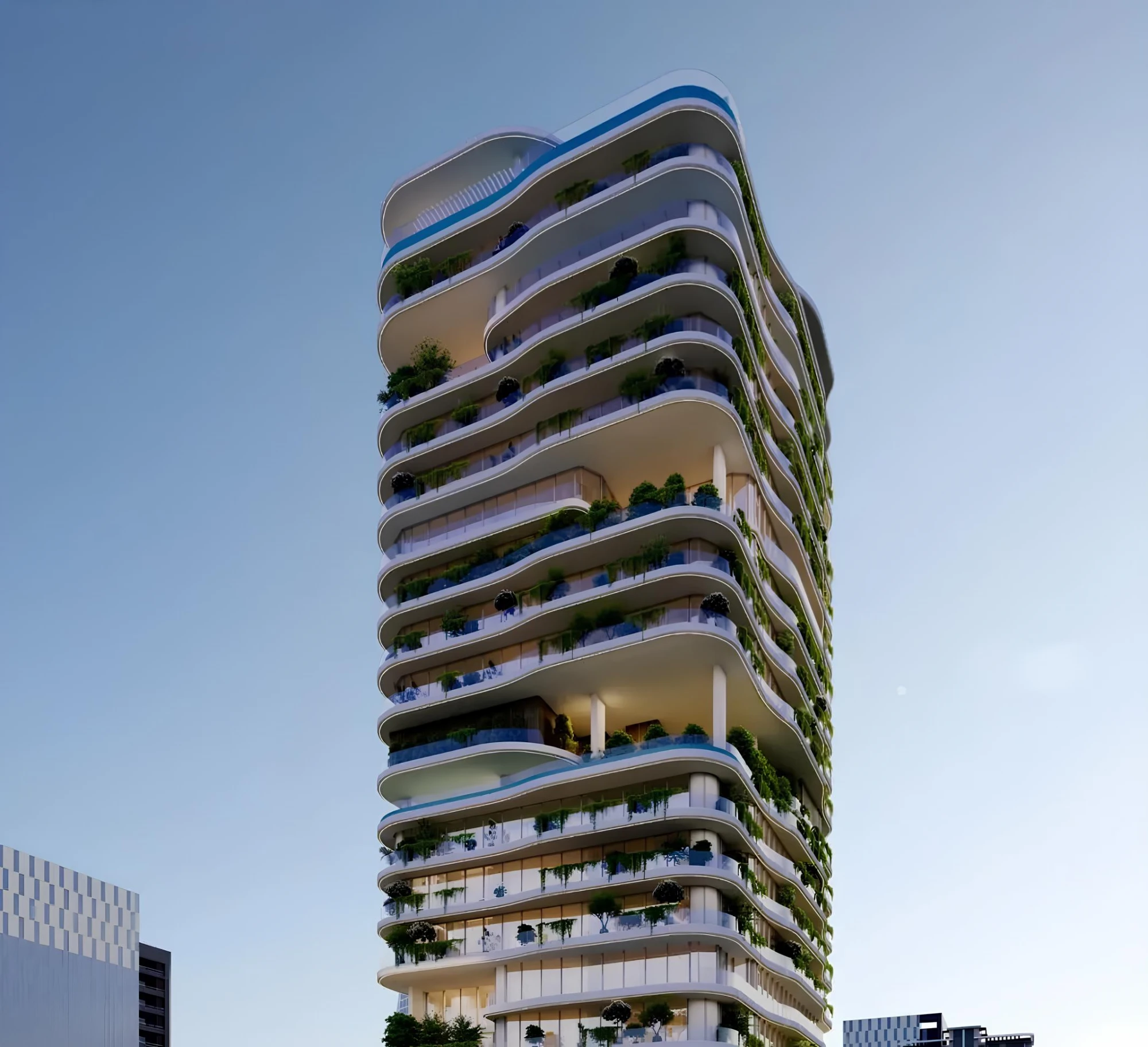 Architecturally, Azure Park Residences combines natural textures with a modern building massing. Extensive glazing supports natural light and openness, while greenery is treated as a core element of the project’s identity rather than decoration.