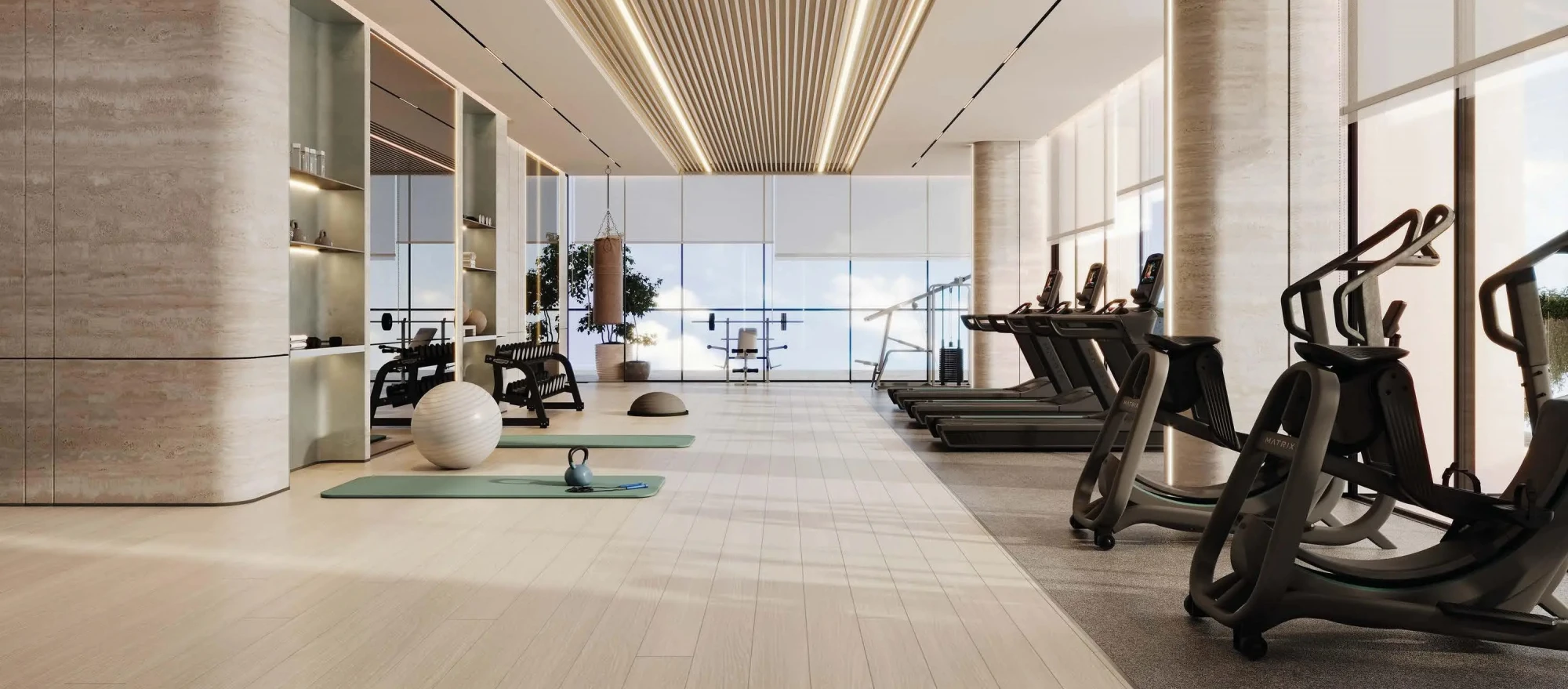 Residents have access to: an infinity pool, sauna, gym, cinema, children’s play area, and private garden spaces for meditation and quiet relaxation.