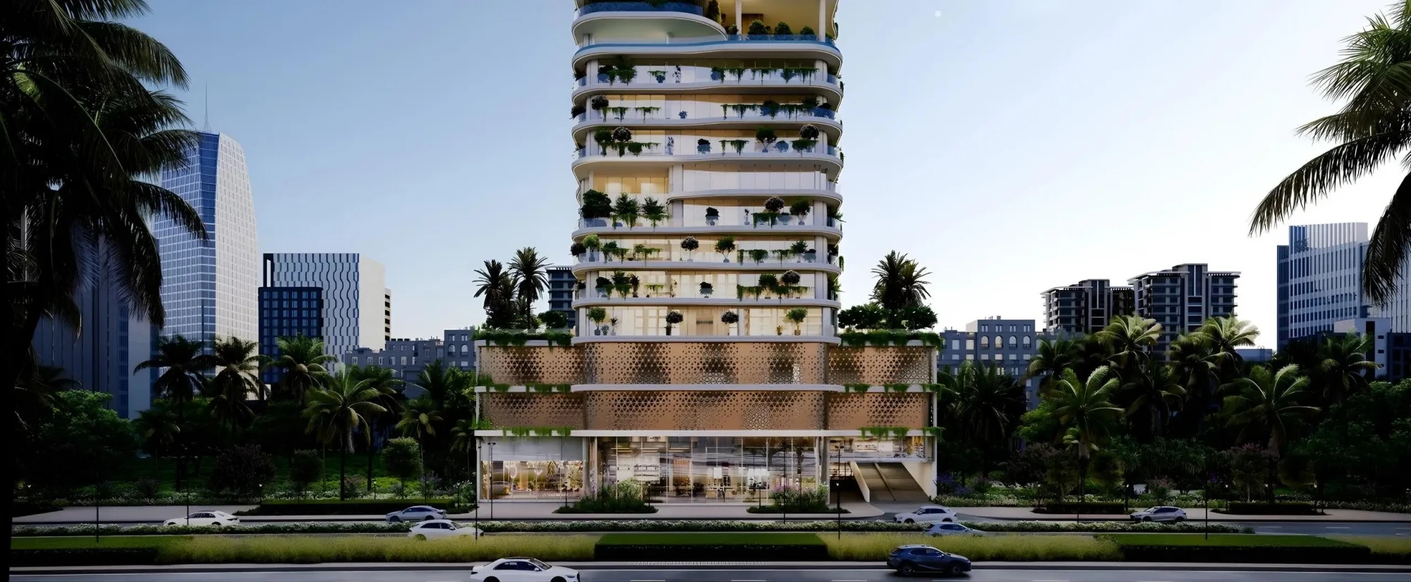 The design concept blends urban living with nature. Soft architectural lines, layered greenery, and natural materials shape the exterior, creating a balanced and private atmosphere.