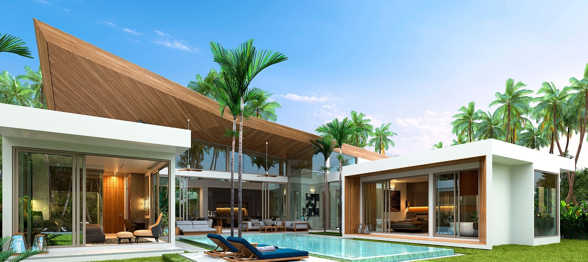 The stylish villa under a unique geometric roof has 3 or 4 bedrooms, a magnificent open-plan living and dining room with high ceilings, a fully equipped kitchen with an island/breakfast bar and a guest bathroom. The interior is bright thanks to the double-height ceiling and glass walls.