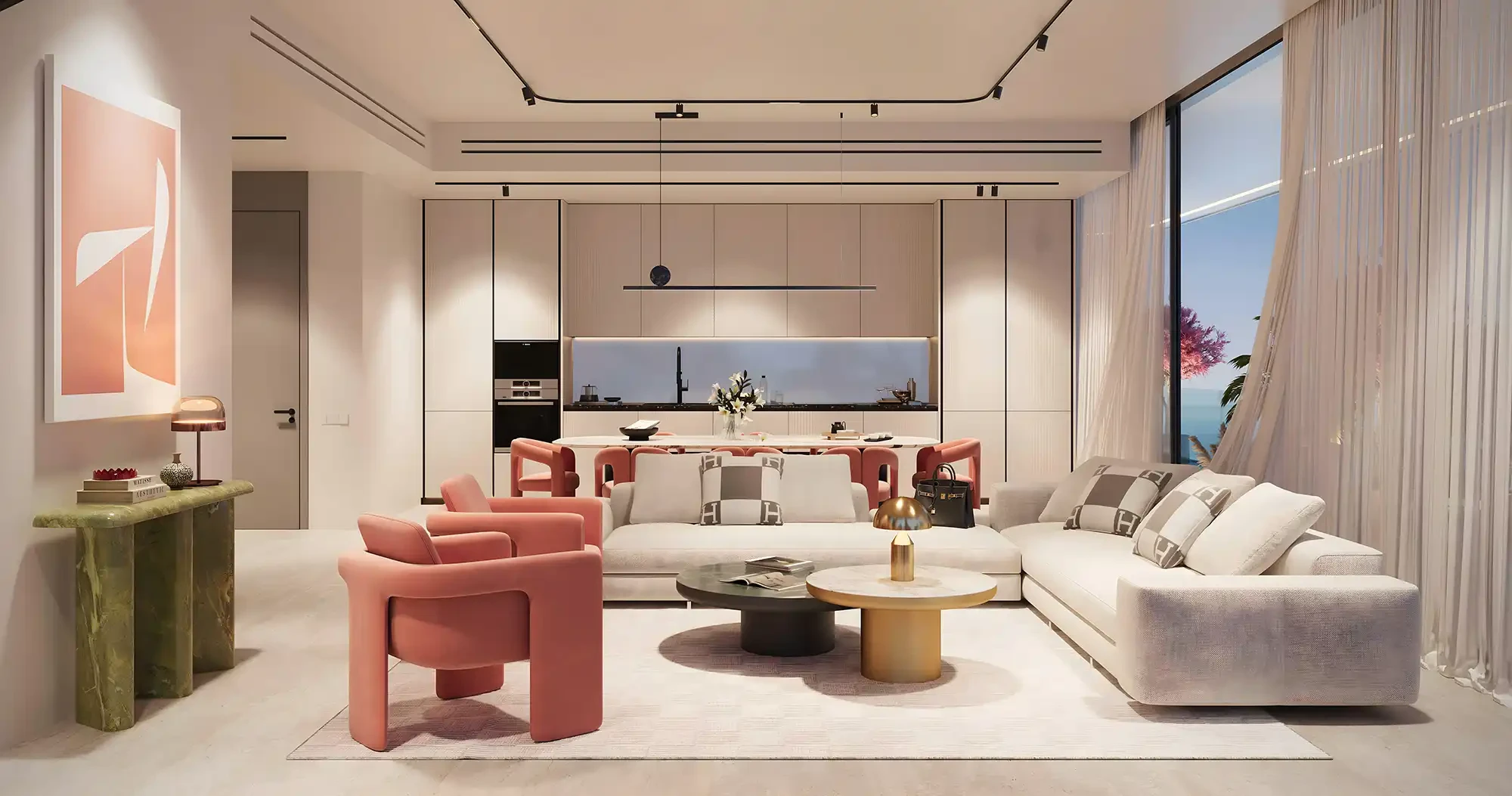 Address Residences The Bay features a modern beachfront aesthetic with vertical glazing, panoramic windows and a light-filled design. Interiors follow the Address brand philosophy — natural tones, quality materials and understated luxury.