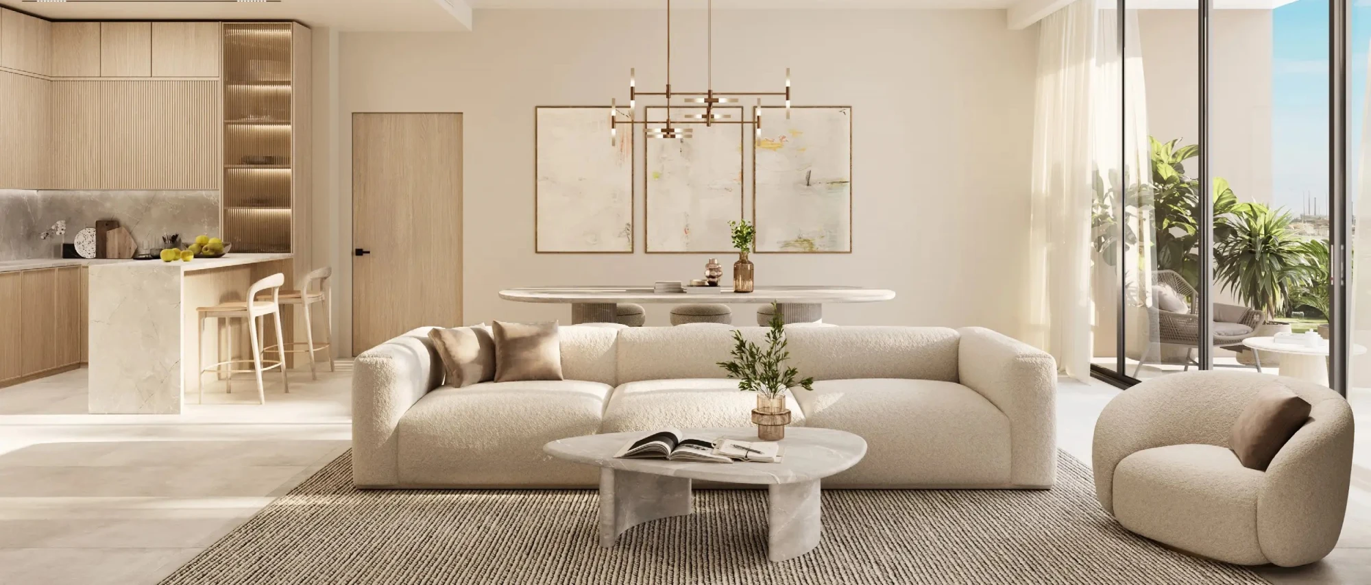 The interior follows a modern Italian-inspired aesthetic — light neutral tones, natural finishes, and restrained textures create a timeless and adaptable environment. The apartment is delivered fully furnished, making it ready for immediate occupancy or rental use.