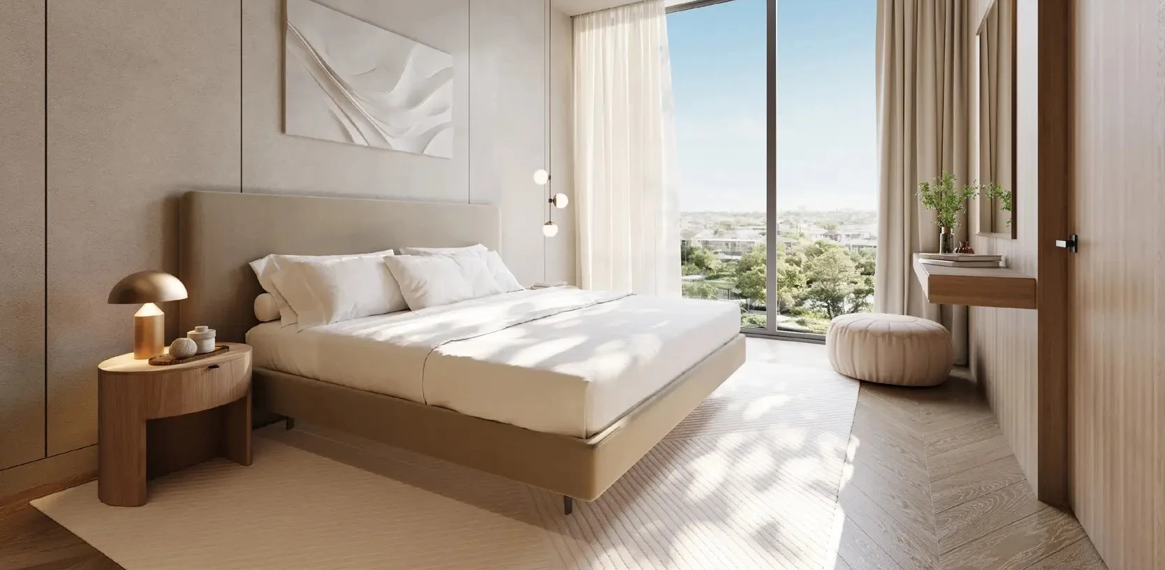 The architectural concept emphasizes soft lines and balanced proportions, shaping a calm residential atmosphere within Dubai Land Residence Complex.