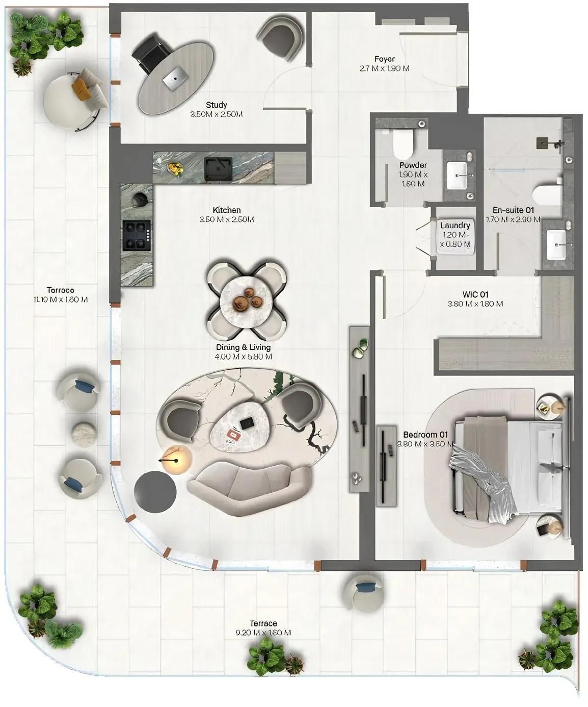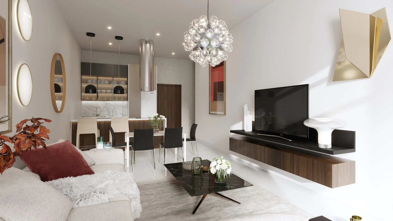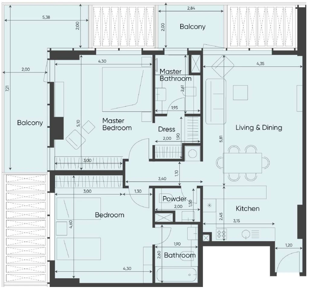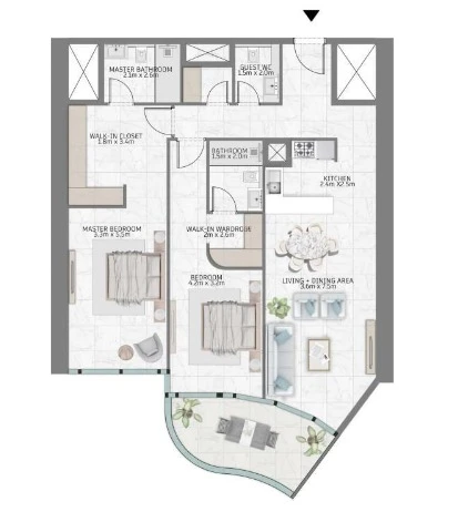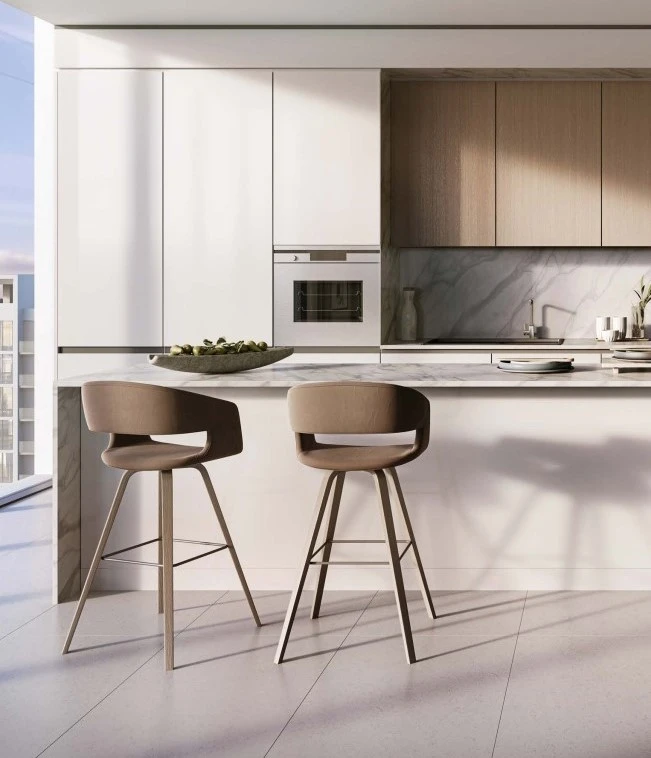 The layout is designed for comfort and functionality: a spacious living area with access to a private balcony, a fully fitted kitchen with built-in appliances, two bedrooms with built-in wardrobes, bathrooms, and a separate laundry area. Floor-to-ceiling glazing offers views of the Crystal Lagoon and landscaped surroundings. Naya residences are planned to maximize natural light and practical living space.