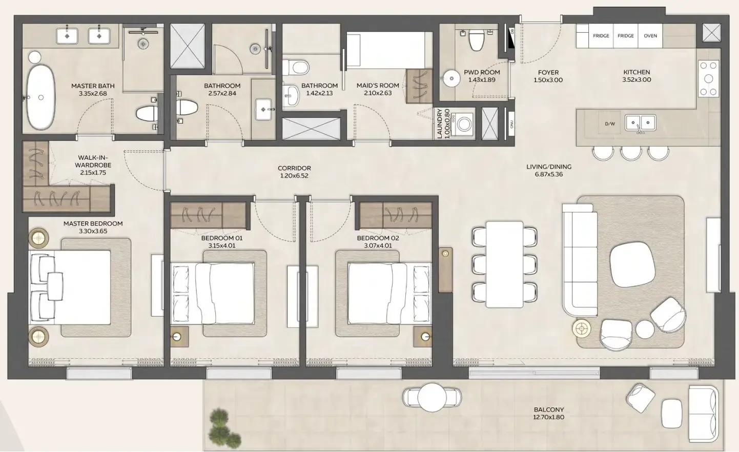 - Layout: 3 bedrooms, large living and dining area, open kitchen, bathrooms;
