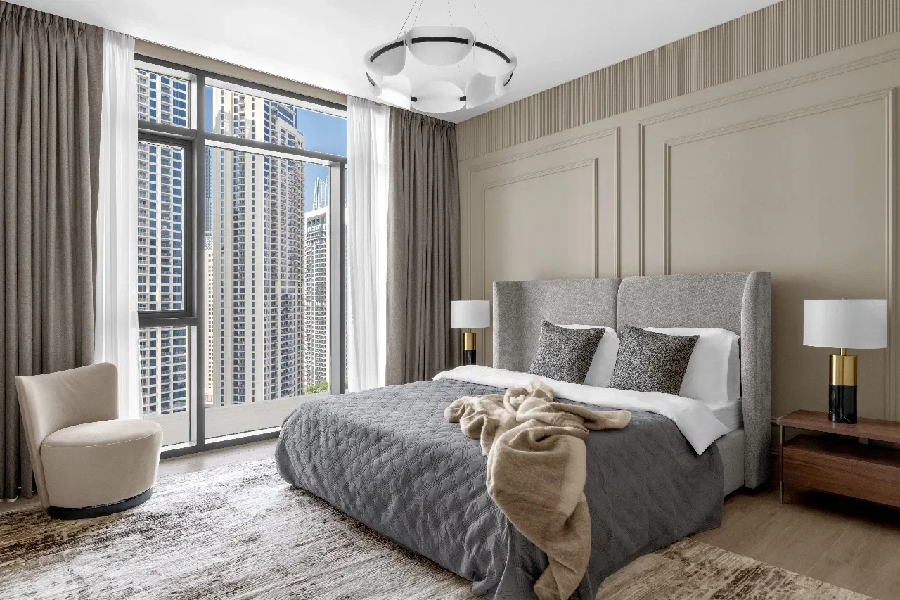 Panoramic floor-to-ceiling windows open stunning views of Burj Khalifa and Downtown Dubai, filling the home with natural light and urban sophistication.