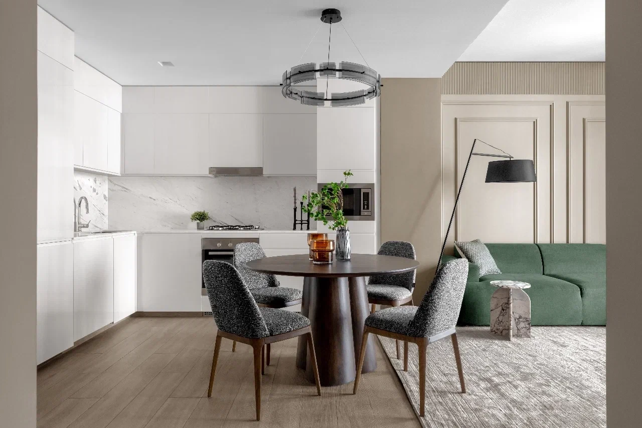 – Natural stone, wood, quartz surfaces, and high-end fittings.