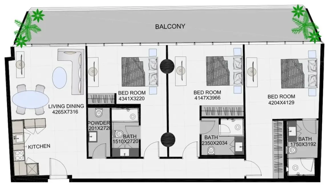 – Layout: bedroom, open-plan living room and kitchen, 2 bathrooms;
