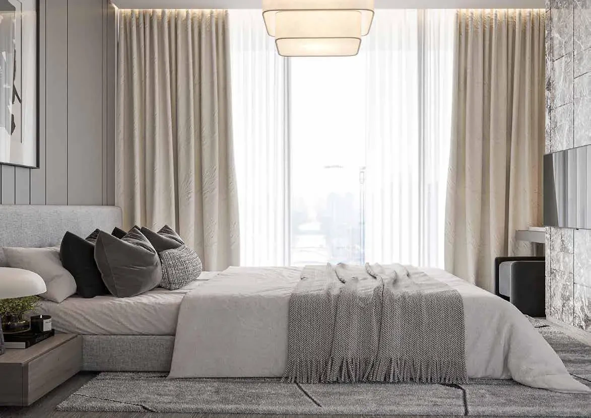The interiors are designed in soft, neutral tones, with open layouts and premium finishes. A spacious living area connects to an open kitchen and a balcony overlooking the landscaped community. The master bedroom includes an en-suite bathroom, while the second bedroom can serve as a guest room or home office.
