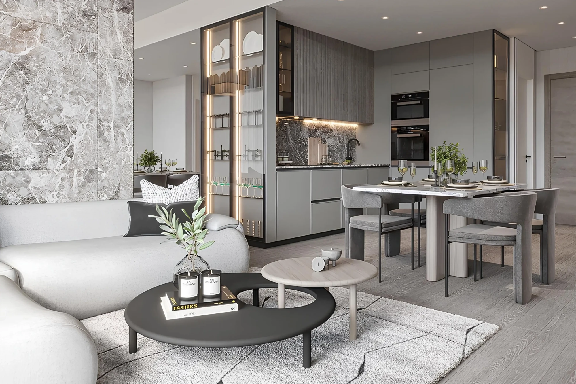 — Bright open-plan living and kitchen area;