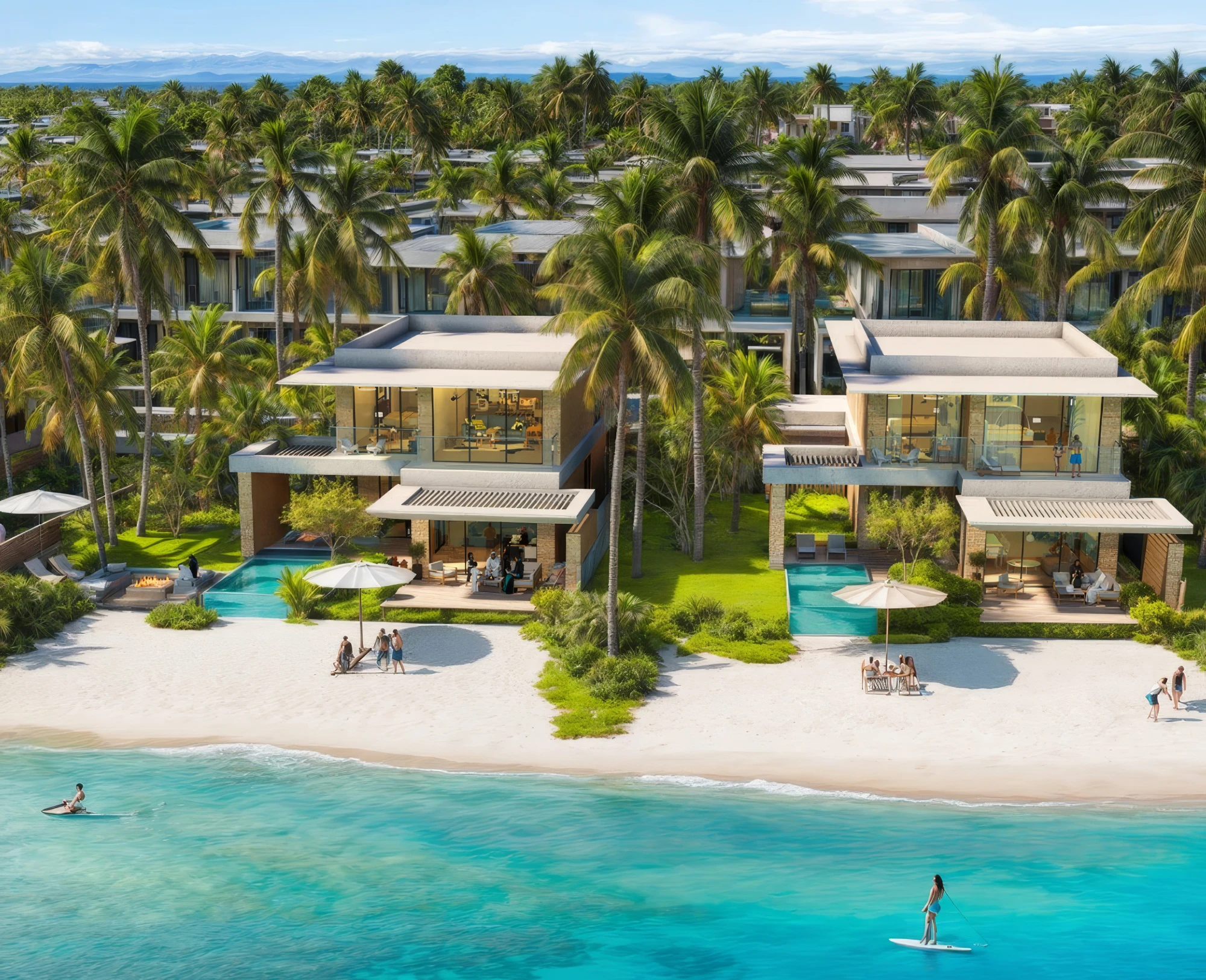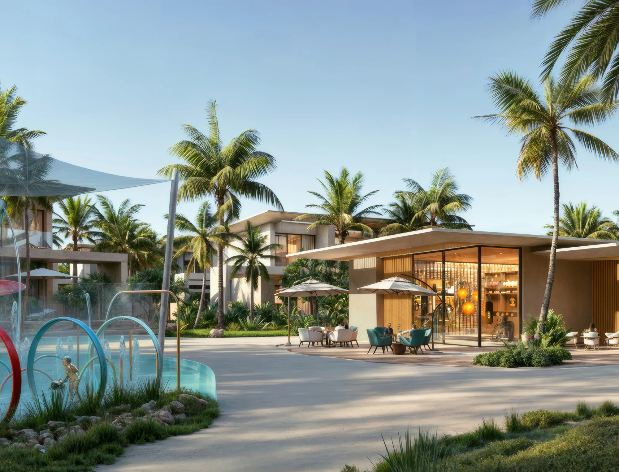 Amenities: panoramic windows, children's playground, water slides, lake, bicycle paths, park for walking, various cafes and shopping areas.