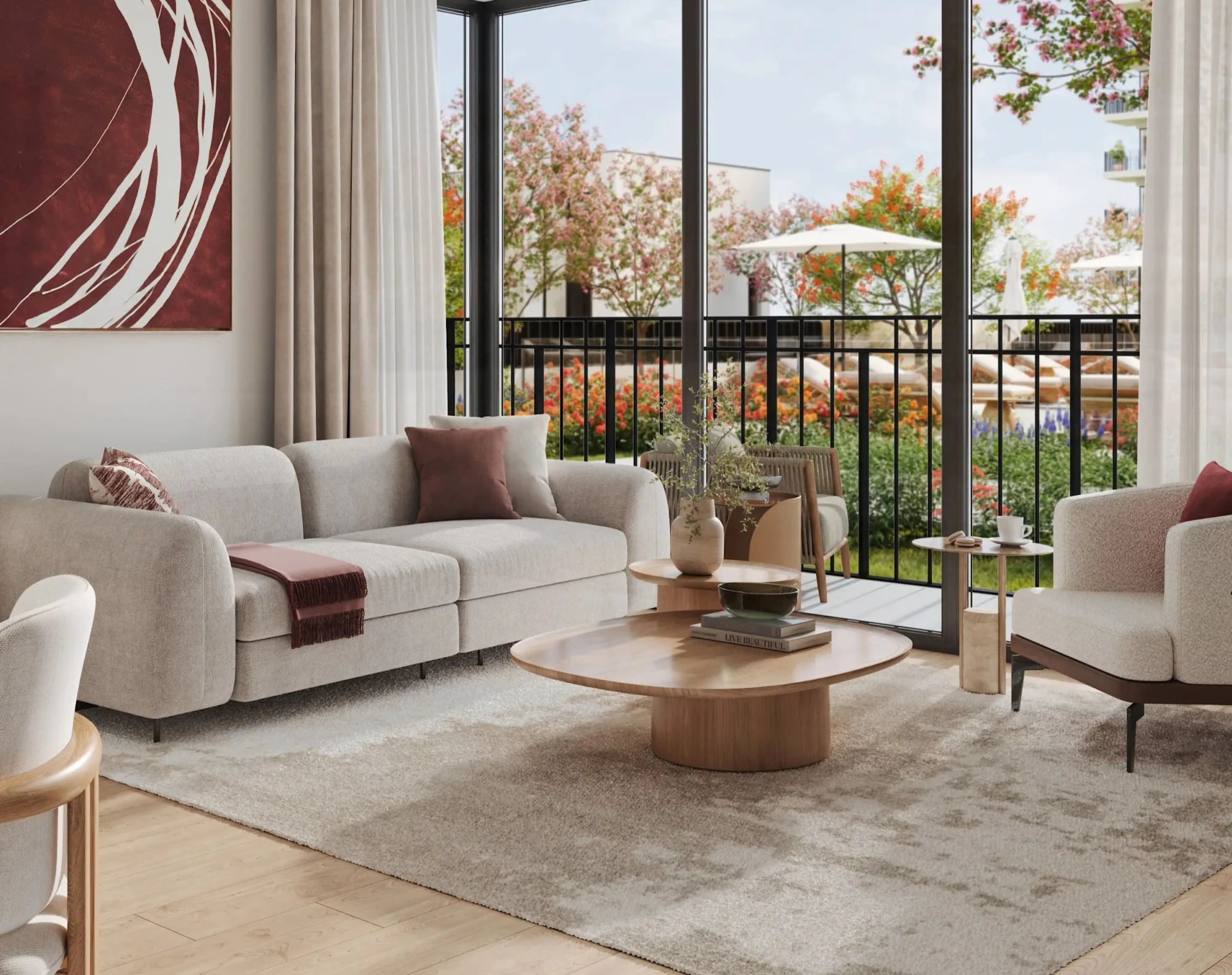 The design of Azizi Gardens reflects harmony with nature. The building is surrounded by lush greenery, while interiors feature natural tones and premium materials. Apartments offer functional layouts, high ceilings, and panoramic windows with perforated panels that allow optimal natural light and create a cozy atmosphere.