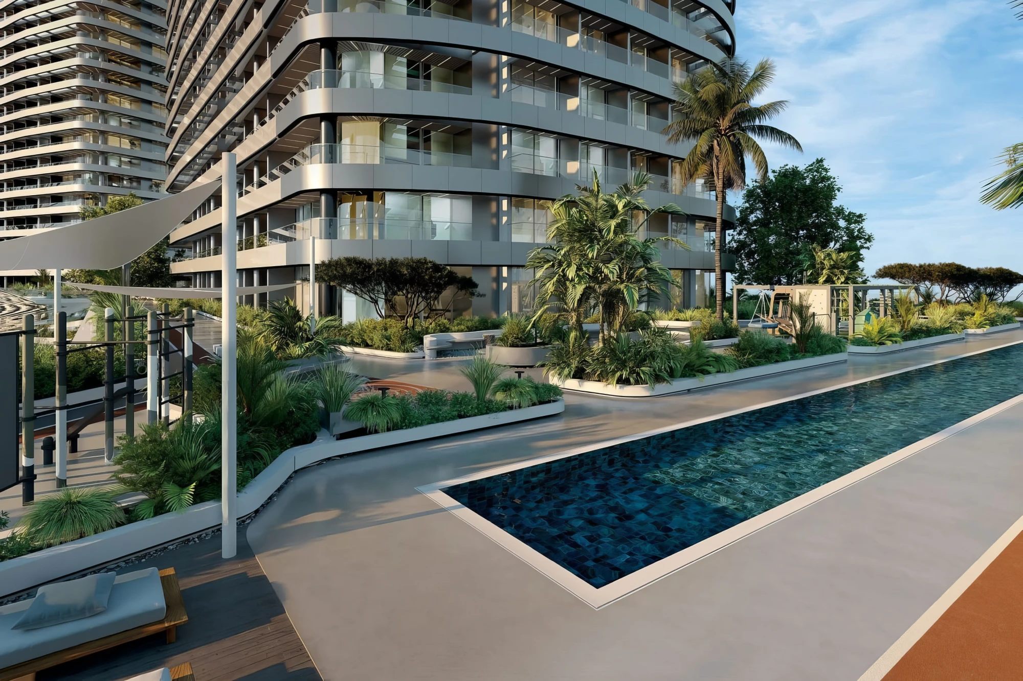 Balcony, concierge, freight elevator, passenger elevator, swimming pool