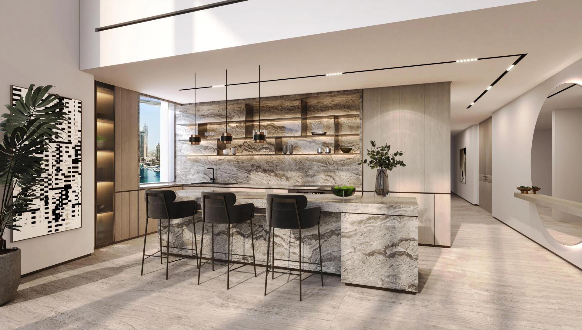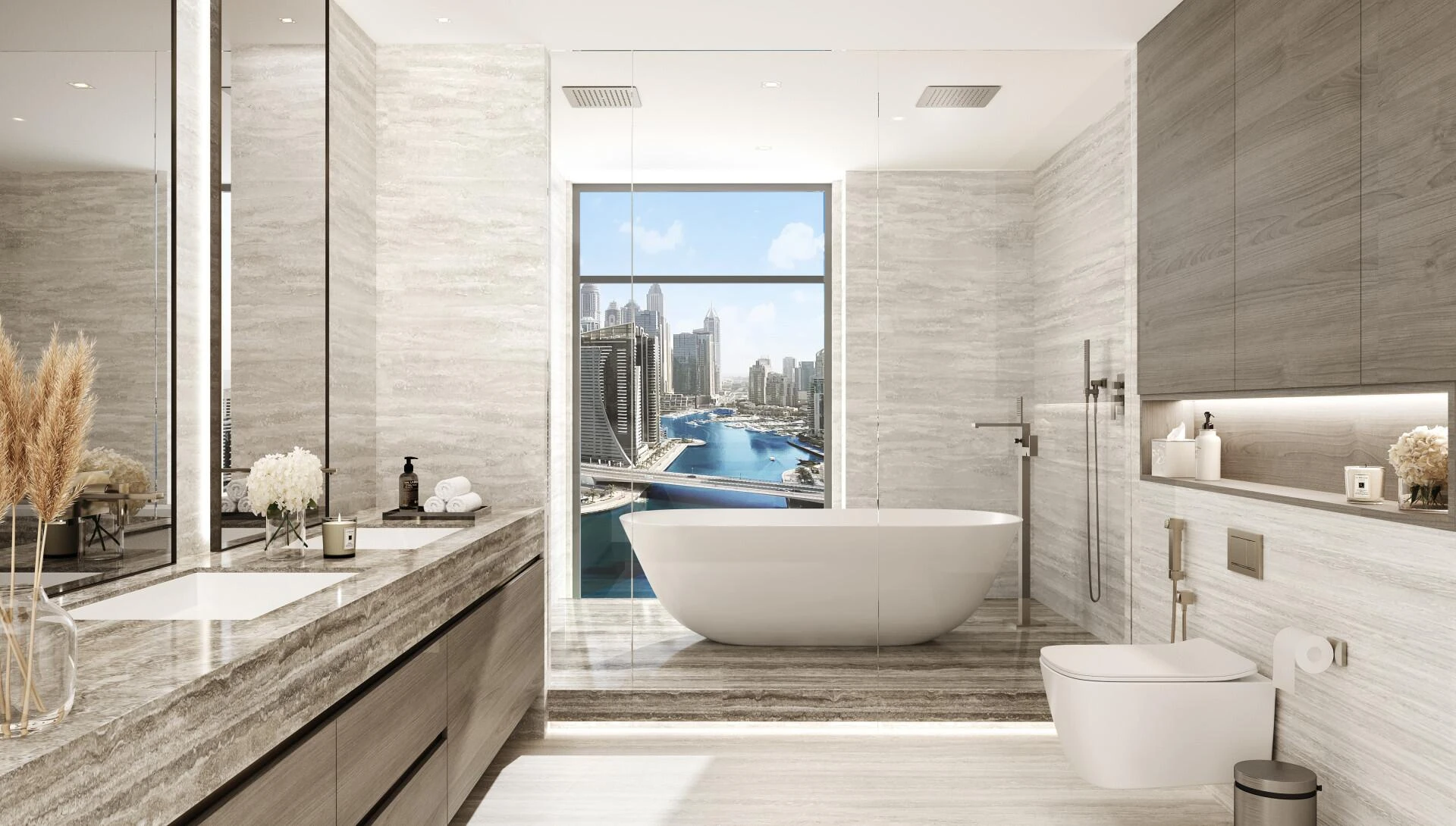 Each residence showcases bespoke finishes, high ceilings, and panoramic floor-to-ceiling windows framing views of Burj Khalifa, Downtown Dubai, and the Arabian Gulf. Premium materials, private elevators, and thoughtful layouts create an atmosphere of refined luxury.