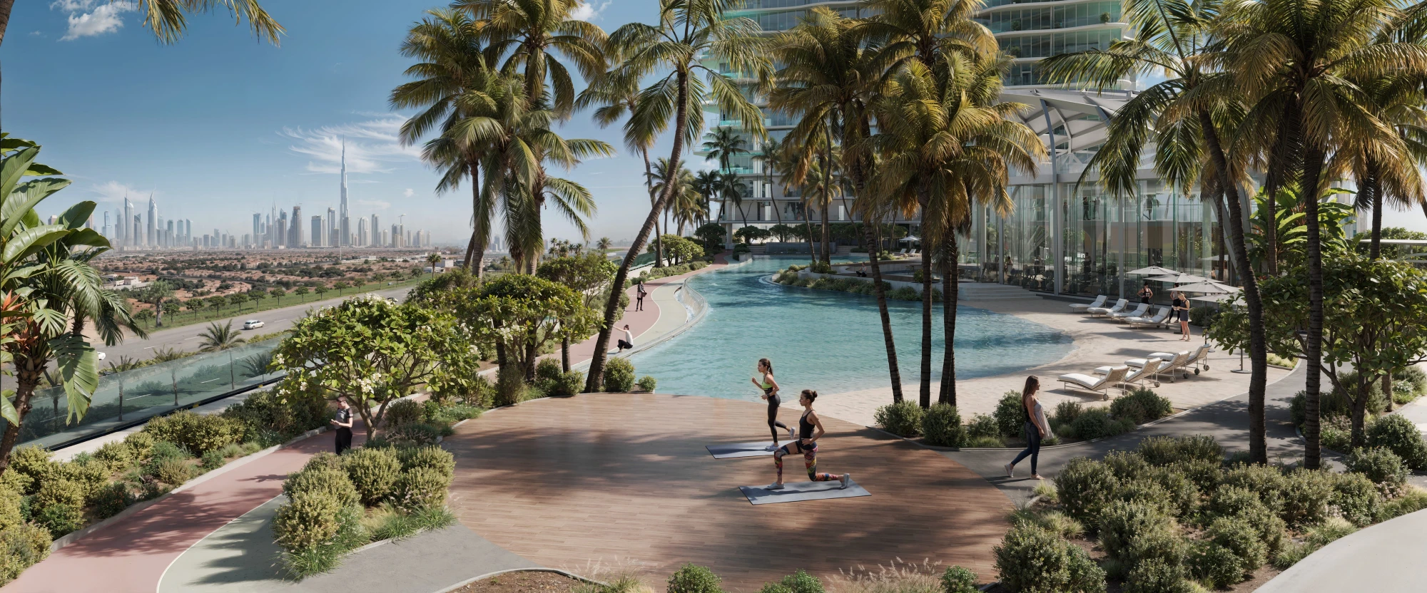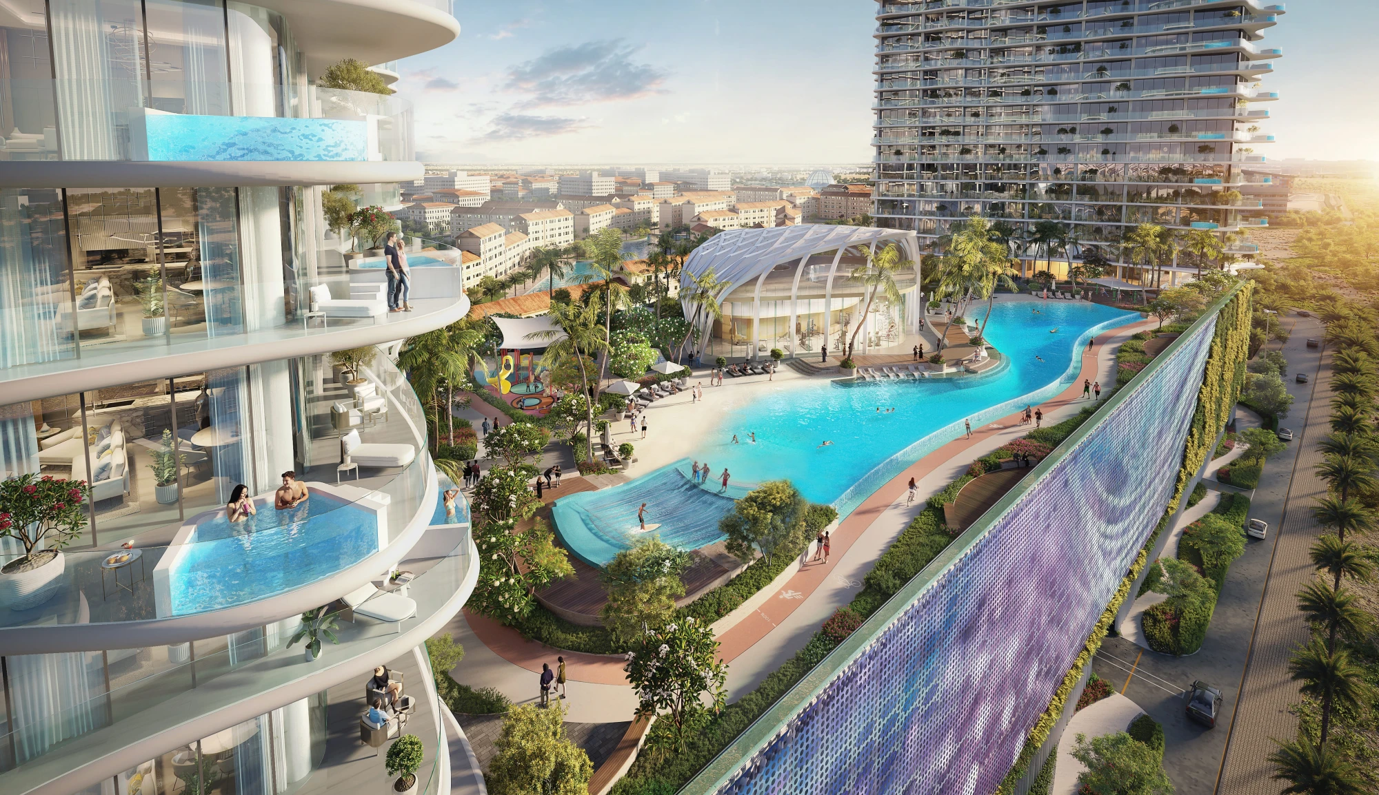 Laguna Residence by One Development — twin towers with lagoon pool and 30+ amenities. Completion — Q4 2027.