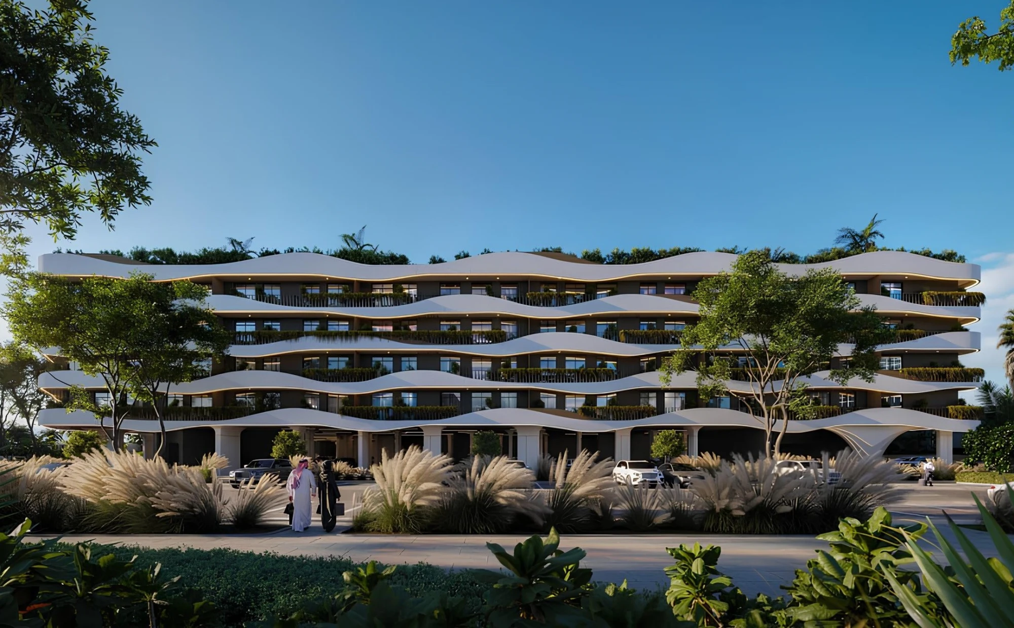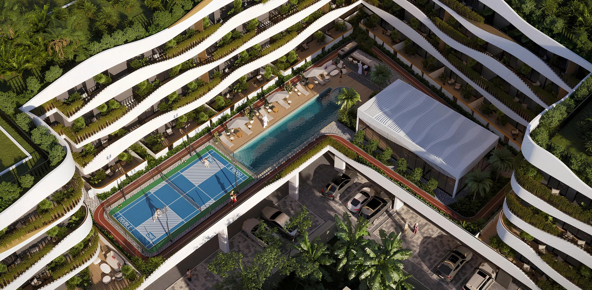 The building features a Ground Floor plus four residential levels (G+4) with 159 fully furnished premium residences, including studios and 1-, 2-, and 3-bedroom apartments. The rooftop garden adds a touch of serenity, while the building’s soft wave-like architecture and full-height glazing create a distinctive modern aesthetic.
