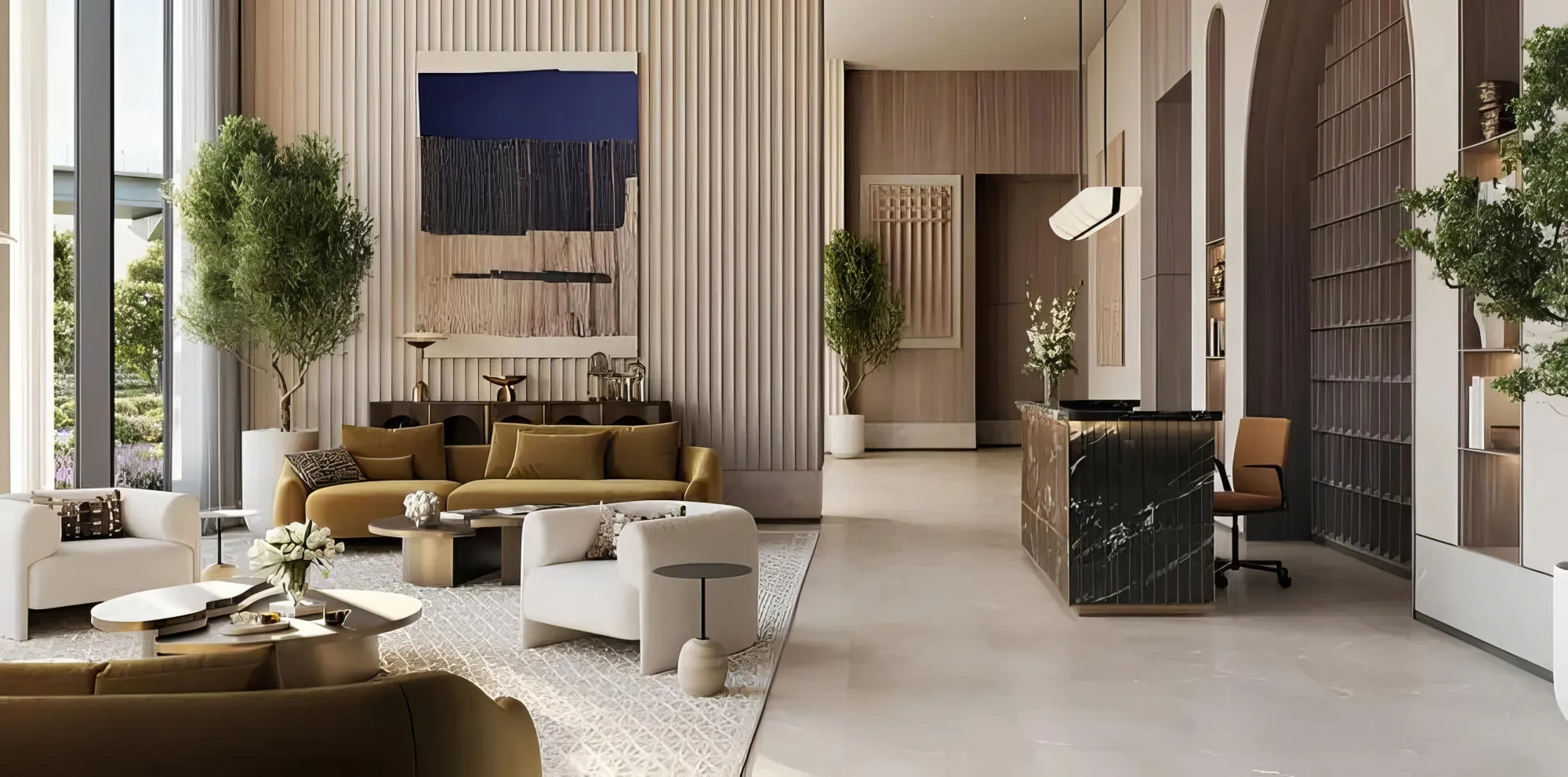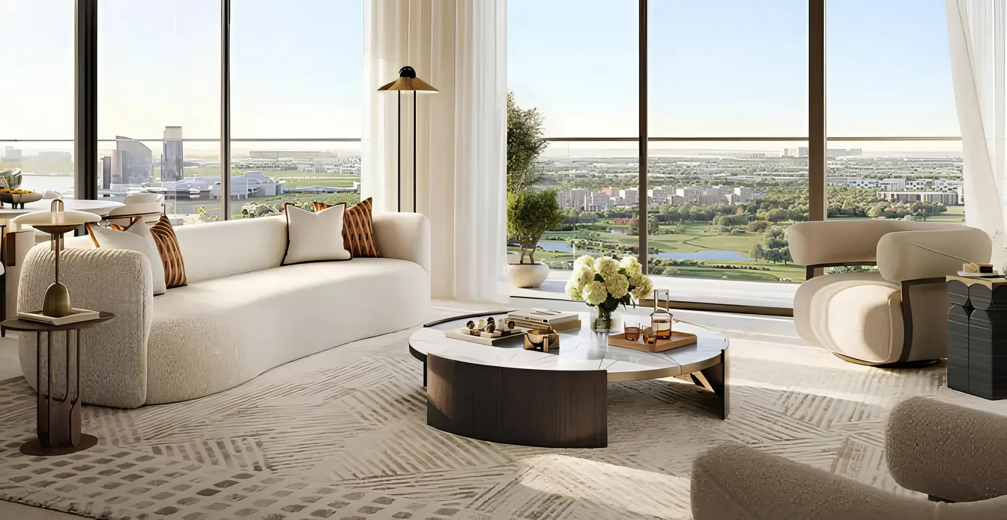 Each residence is crafted in neutral tones, combining rich textures, elegant finishes, and floor-to-ceiling windows with breathtaking views of the water and city skyline.