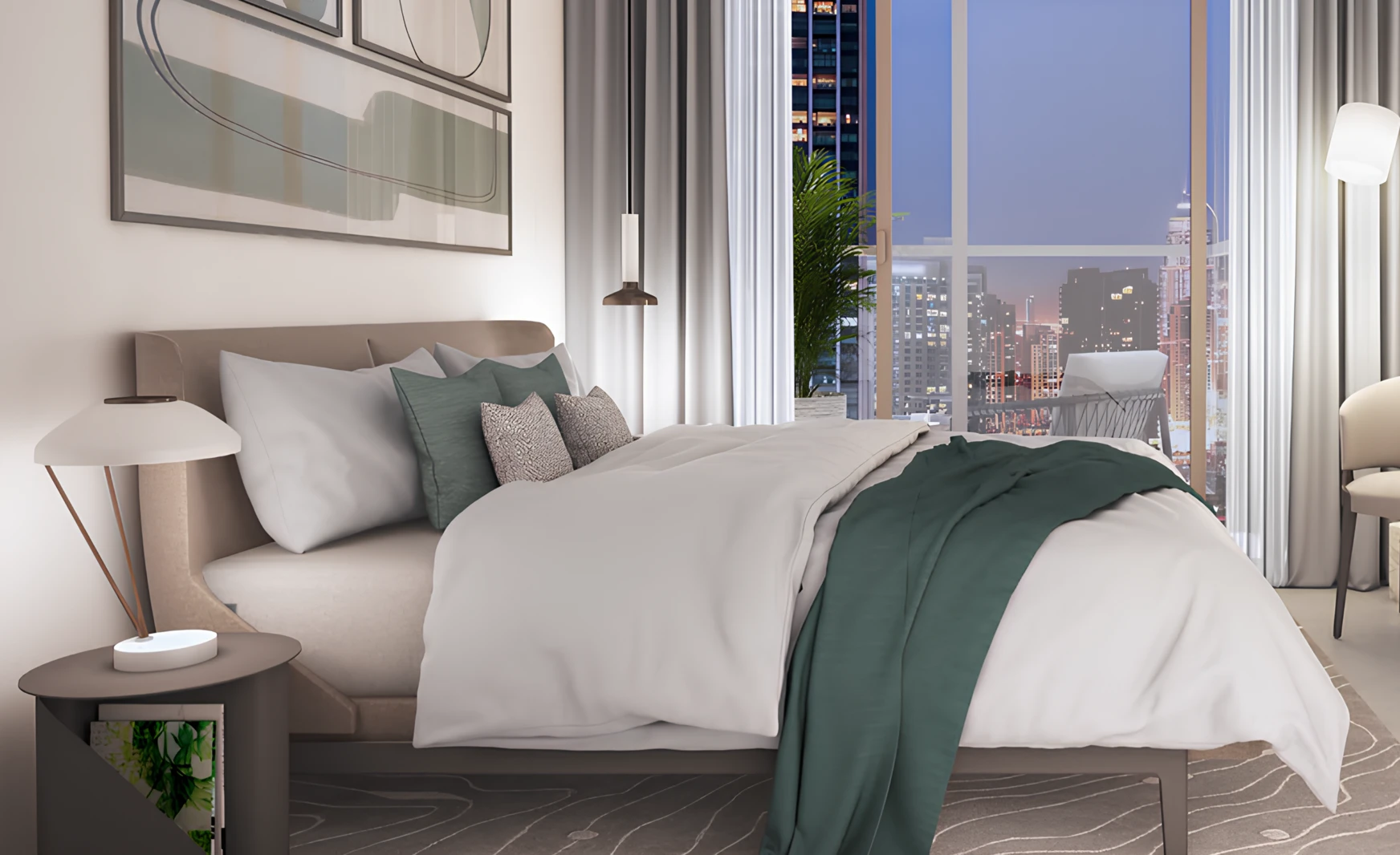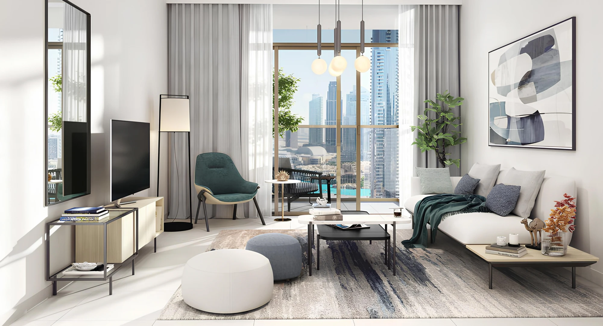 Floor-to-ceiling windows fill the interiors with natural light and frame breathtaking views of Burj Khalifa, Dubai Opera, and Sheikh Mohammed Bin Rashid Boulevard.