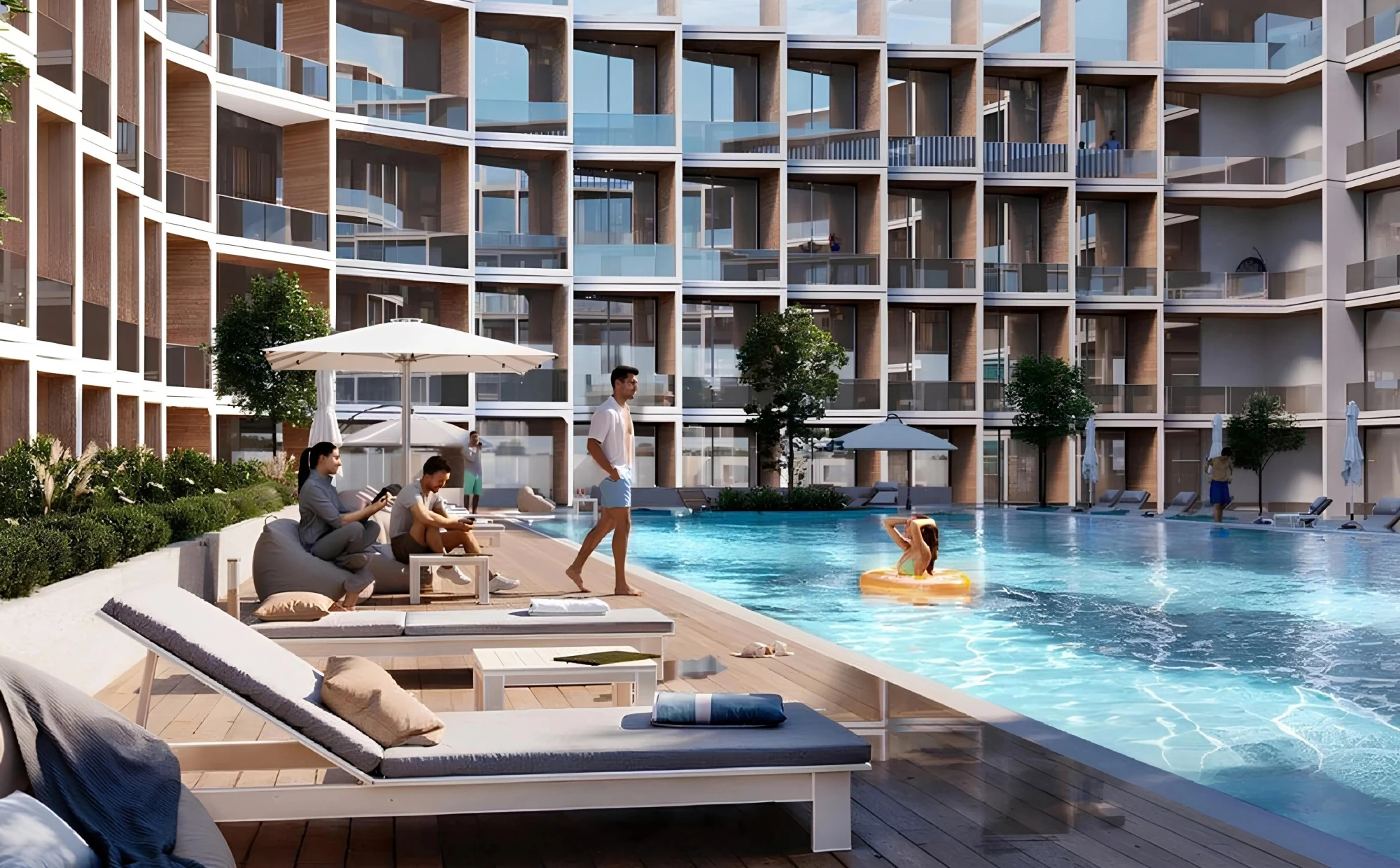 The architecture of the building reflects Binghatti’s signature style with an emphasis on modern geometry and expressive lines. The light color palette highlights the dynamic nature of the project, while panoramic windows provide natural lighting and open views of the surrounding Arjan area. Interiors are designed with functionality and comfort in mind, using high-quality materials in neutral tones to create a harmonious atmosphere.