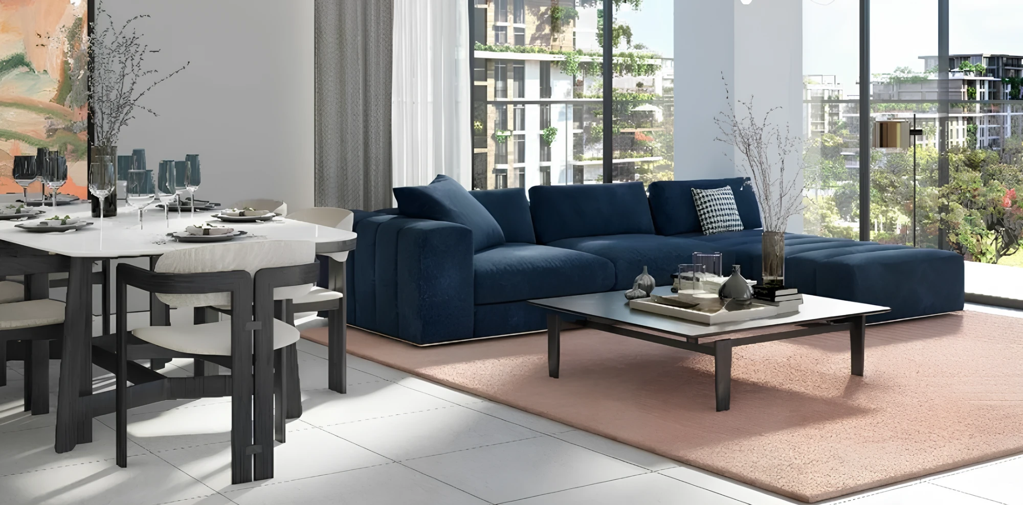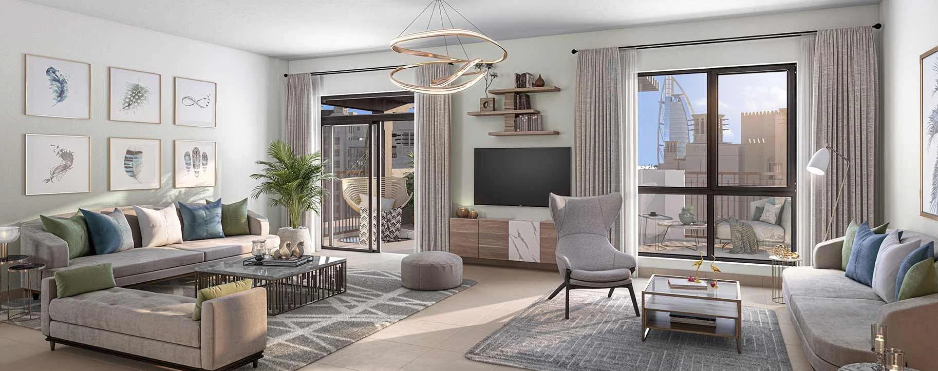 The interiors are designed in light natural tones, using warm wood, textured stone, and tactile materials. Every residence features panoramic windows, open layouts, and fully fitted kitchens, offering comfort, elegance, and unobstructed views of the Arabian Gulf, Downtown Dubai, and the marina skyline.