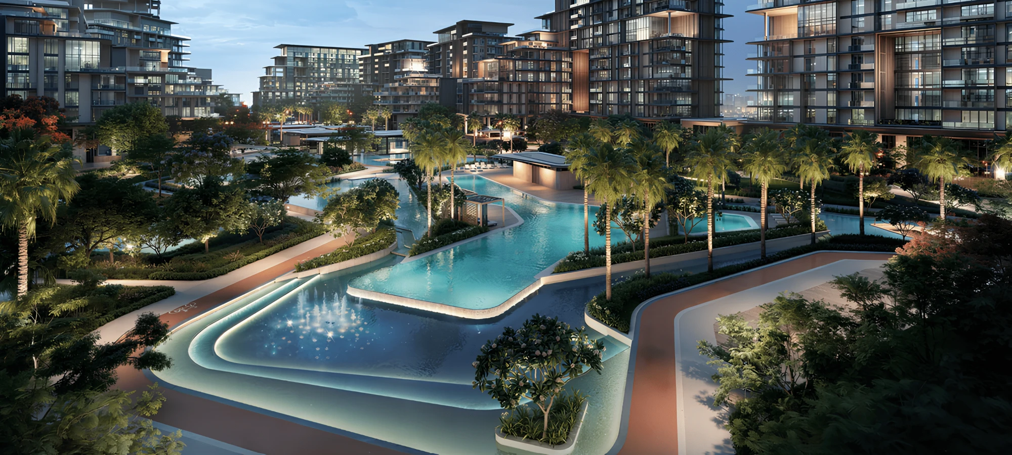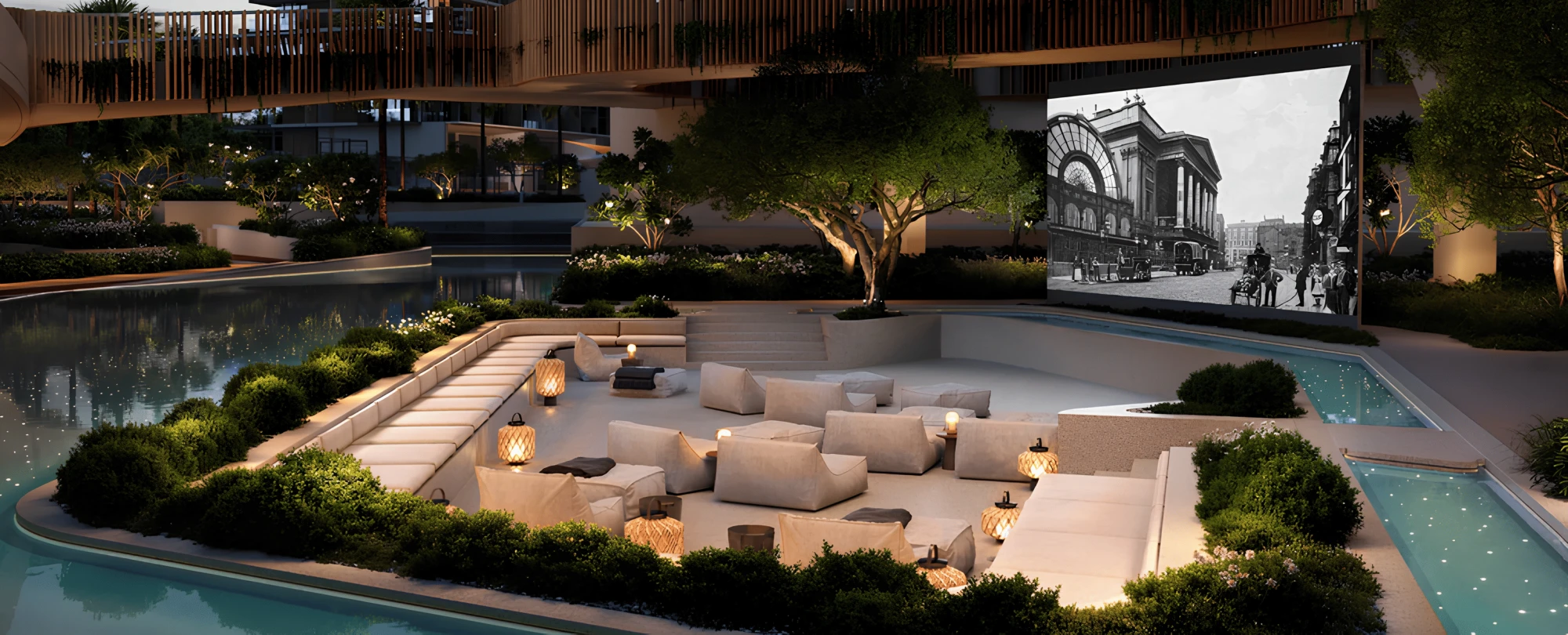 — Library, café, coworking lounges, and cinema within the glass Pavilion clubhouse;