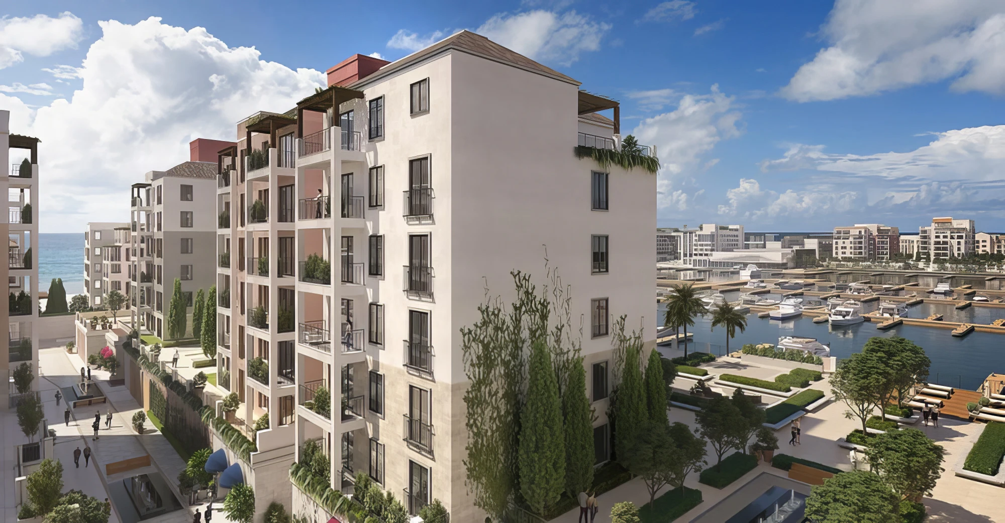 The design of Portside Square celebrates the harmony between form and nature. The towers feature wave-like facades that reflect the motion of the sea and light throughout the day. Spacious balconies, green terraces, and open glass structures create an atmosphere of airiness and connection to the coastal landscape.