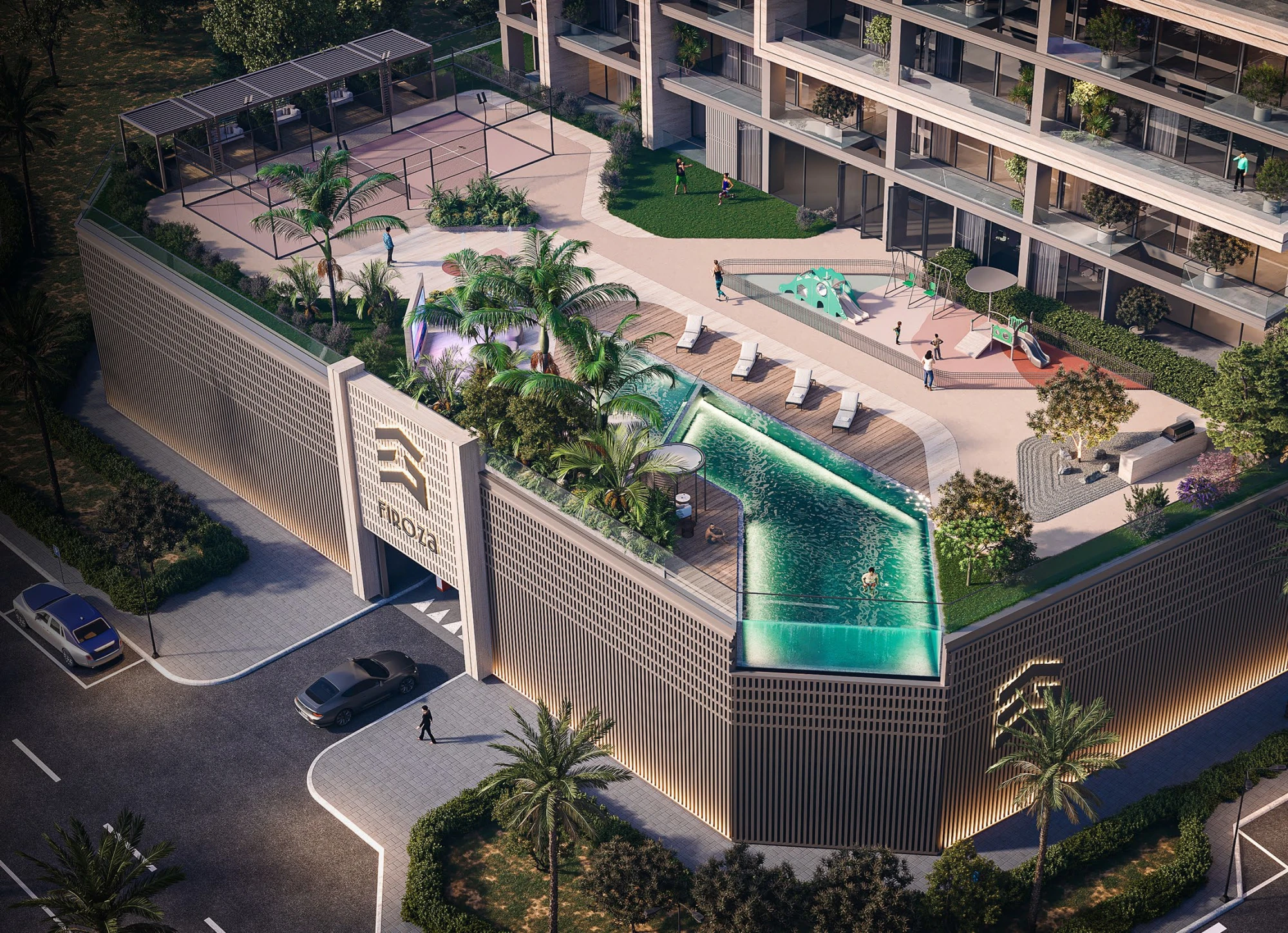 Amenities: infinity pool, Jacuzzi, yoga area, indoor and outdoor gym, barbecue areas, lounge area, and indoor and outdoor playgrounds.