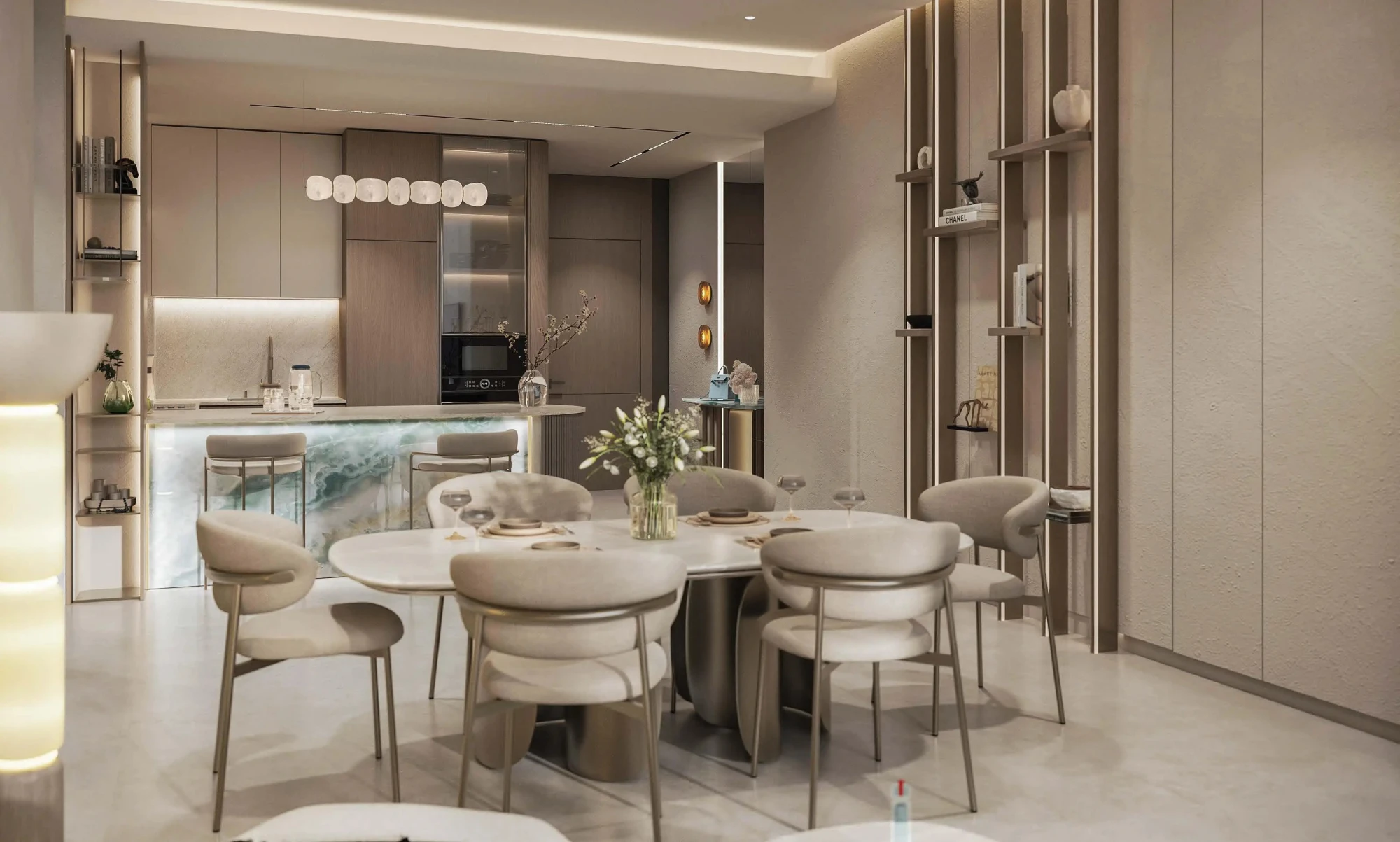 The development offers studios and 1-, 2-, and 3-bedroom apartments. Interiors feature natural stone and high-quality finishing materials, with carefully proportioned layouts that support a calm, well-balanced feel. Apartments are delivered partially furnished, with fitted kitchen appliances included — a practical advantage for investors planning a smoother transition to the rental market.