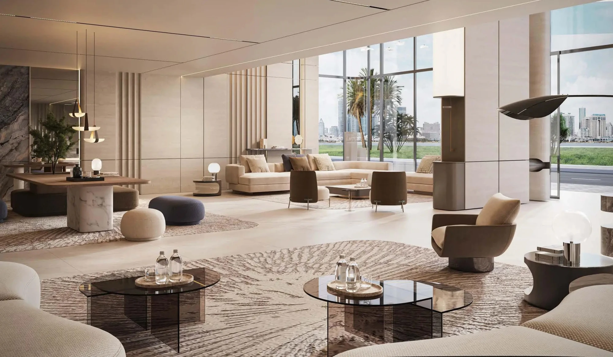 Architecturally, Azure Park Residences combines natural textures with a modern building massing. Extensive glazing supports natural light and openness, while greenery is treated as a core element of the project’s identity rather than decoration.