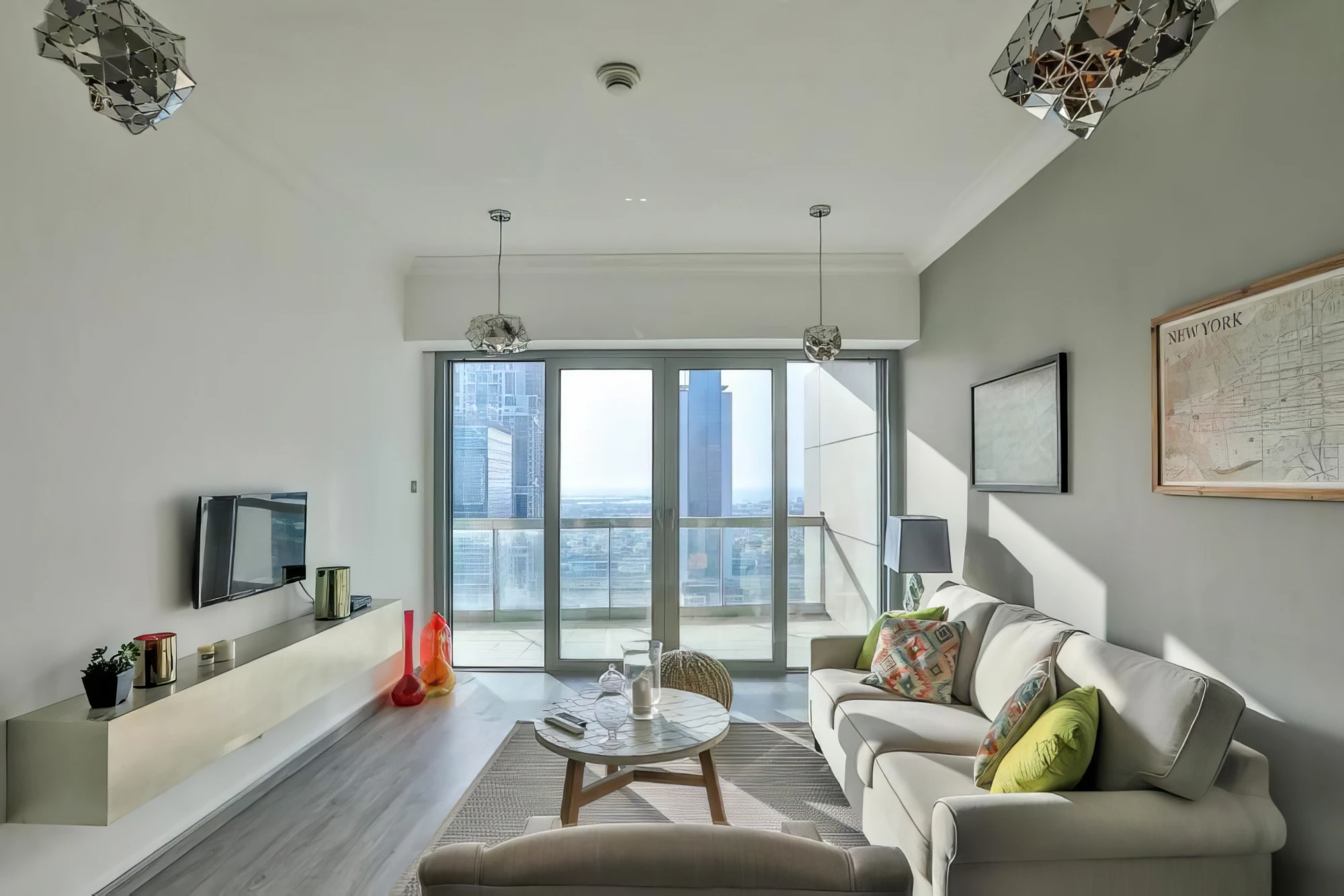 An L-shaped building with an elegant interior. Inside the complex there is a huge swimming pool, gym, yoga studio, coworking spaces and recreation areas.