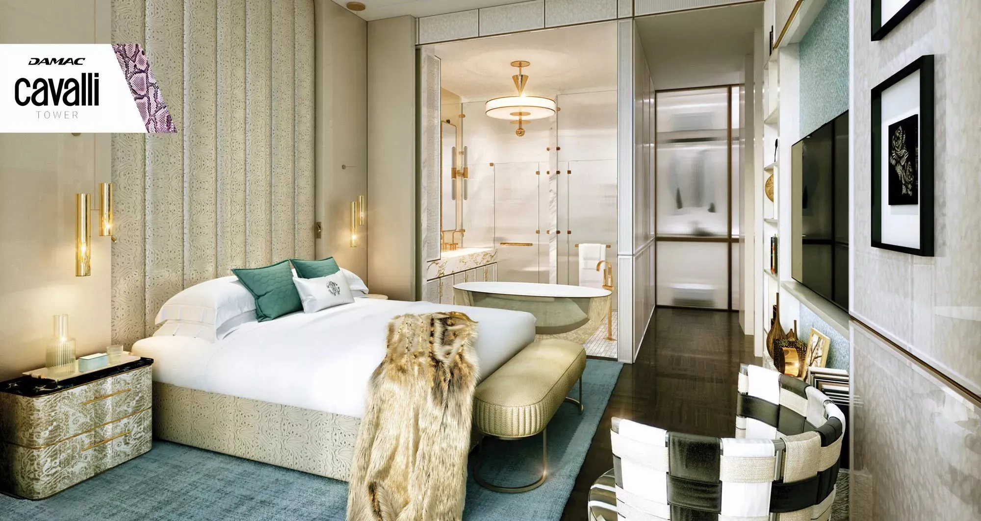 The tower rises 70 stories above Dubai Media City with a striking façade that reflects the city’s modern spirit. Interiors feature Cavalli’s signature style — bold accents, rich textures, and unique materials that create an atmosphere of elegance and sophistication.