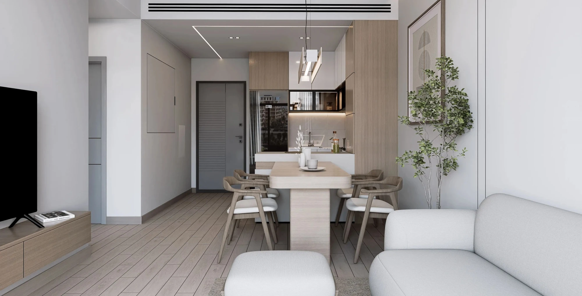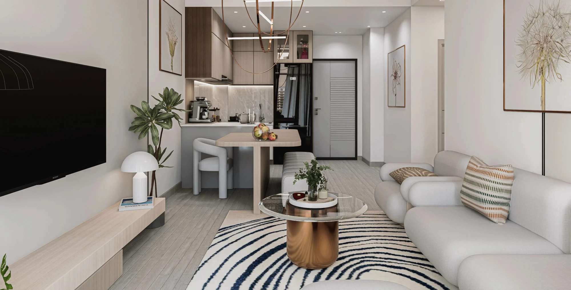 — Spacious living room with an open-plan kitchen and high-quality finishes;