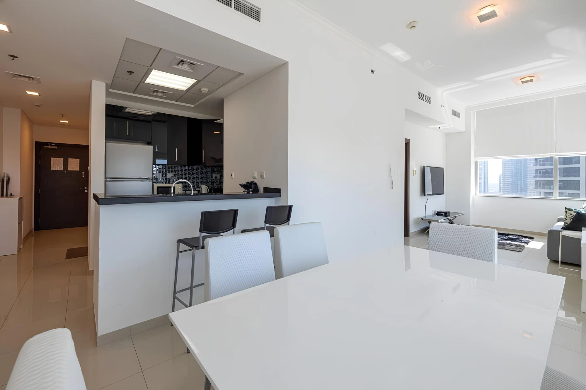 The layout provides a balanced living scenario, with two separate bedrooms, a spacious living area, and a functional kitchen. The apartment is delivered partially furnished, including kitchen appliances, allowing efficient preparation for occupancy or rental.
