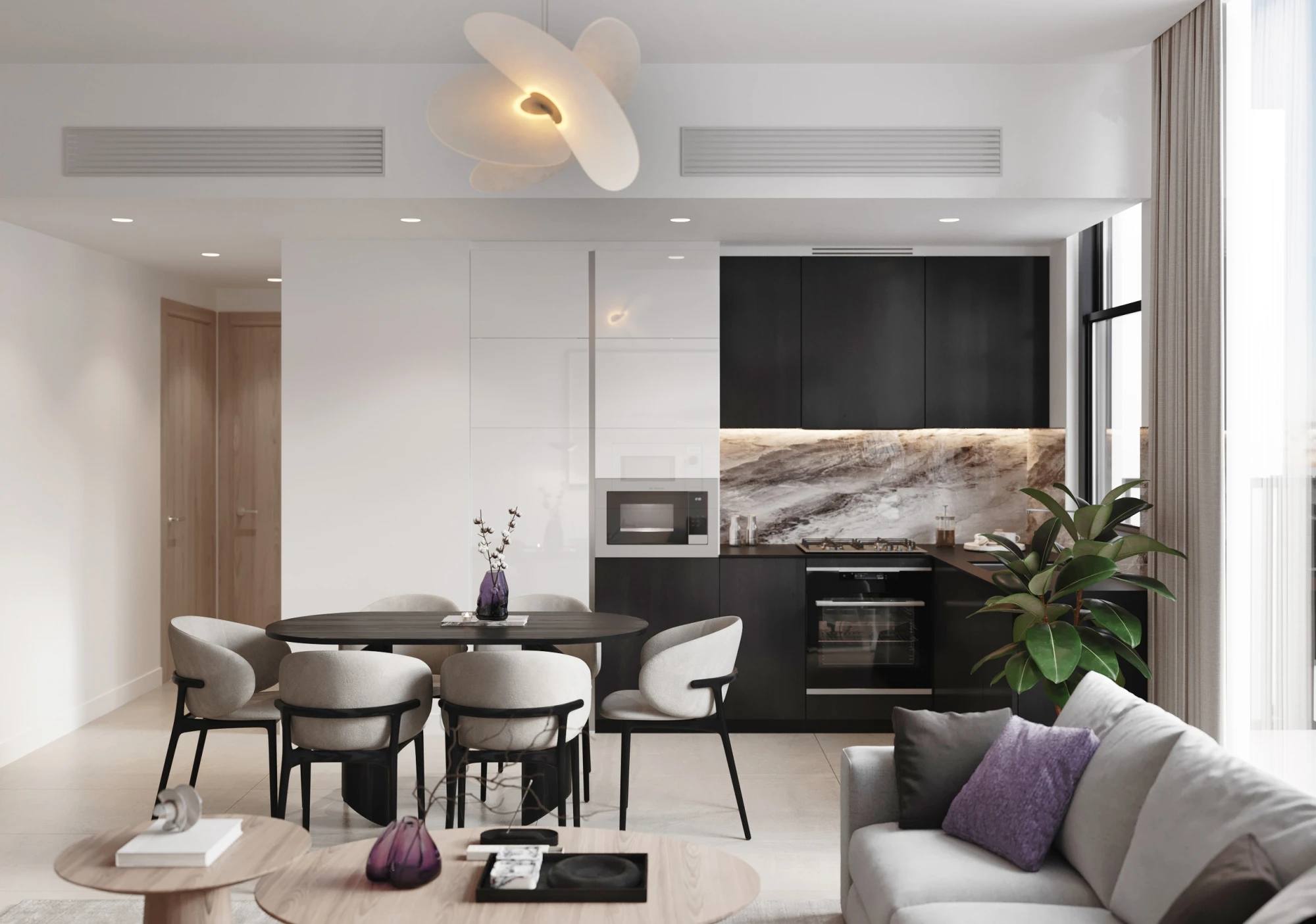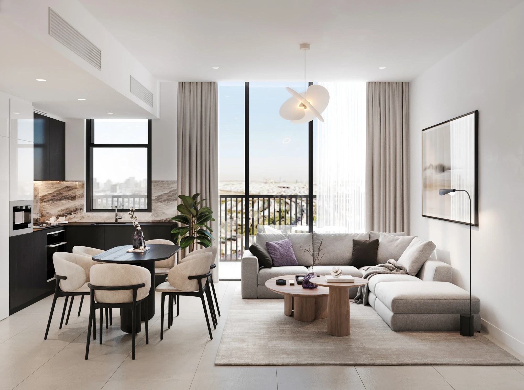 The interior follows a modern Italian-inspired aesthetic — light neutral tones, natural finishes, and restrained textures create a timeless and adaptable environment. The apartment is delivered fully furnished, making it ready for immediate occupancy or rental use.