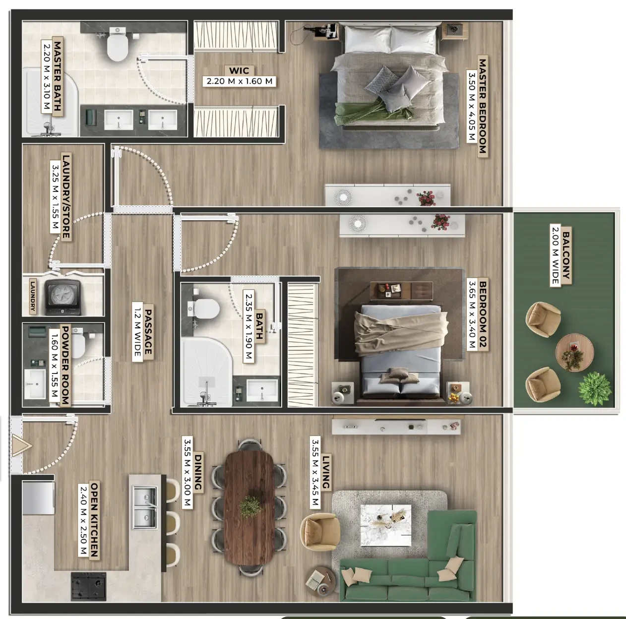 The layout of the apartment features a spacious living room with dining area, modern fitted kitchen and bathroom with top-of-the-line fixtures and fittings. Floor to ceiling panoramic windows and spacious balconies overlooking Dubai Canal.