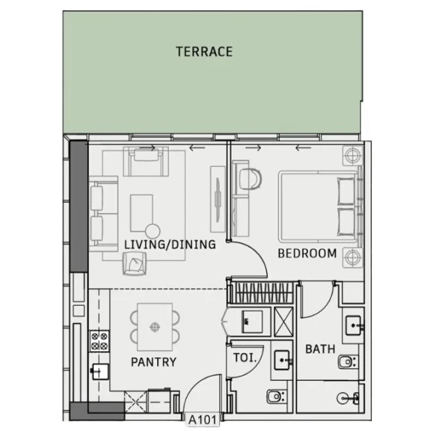 - Private balcony with garden or community view;