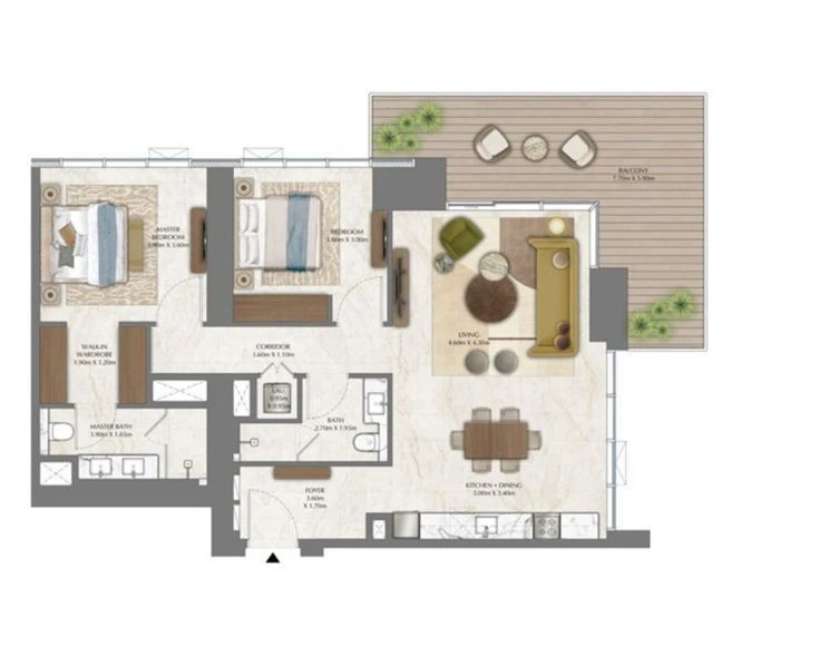 – Layout: 2 bedrooms; 2+ bathrooms; living room; kitchen; balcony;