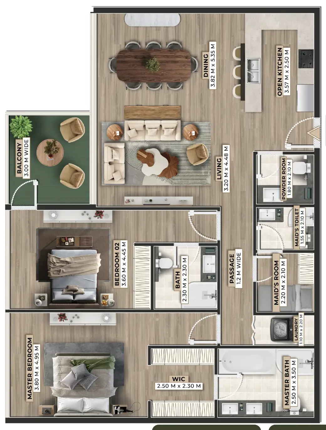 - Layout: 2 bedrooms / 3 bathrooms;