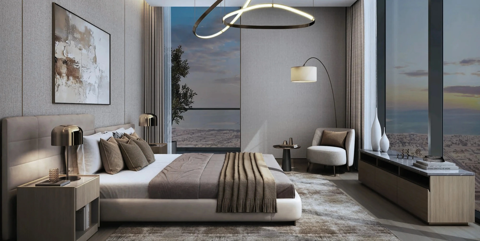- Floor-to-ceiling windows with city views;