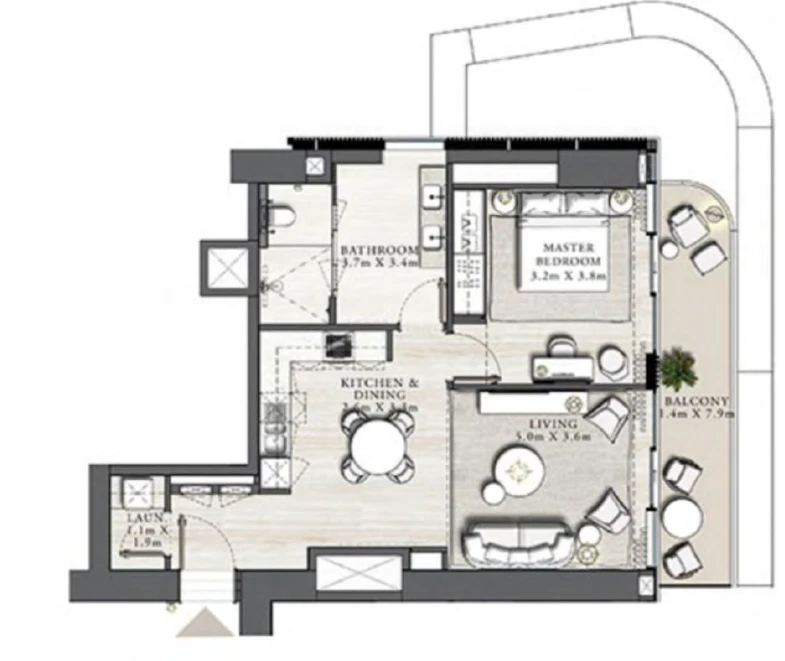 - Layout with spacious living room and bedroom;